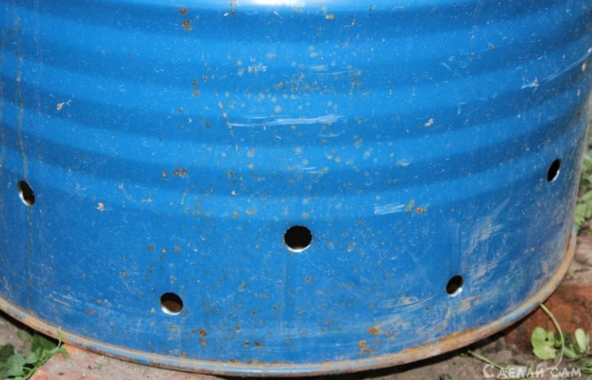 Ступенчатым сверлом по металу сделал отверстия на дне бочки-через них будет просыпаться зола и закачиваться воздух для хорошего горения.