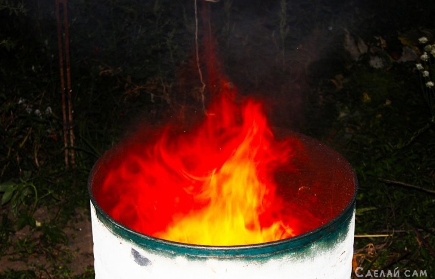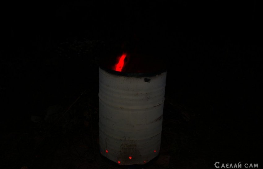 Плюсы сжигания в такой бочке я заметил сразу.Как по мне-горит быстрей,меньше дыма,нет стрельбы в костре а если что и бахнет-все остается в бочке)).