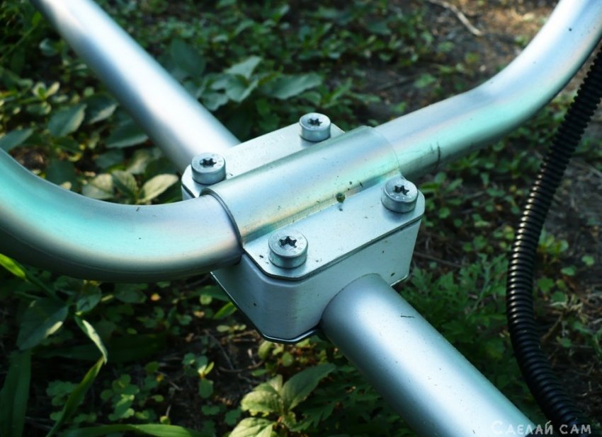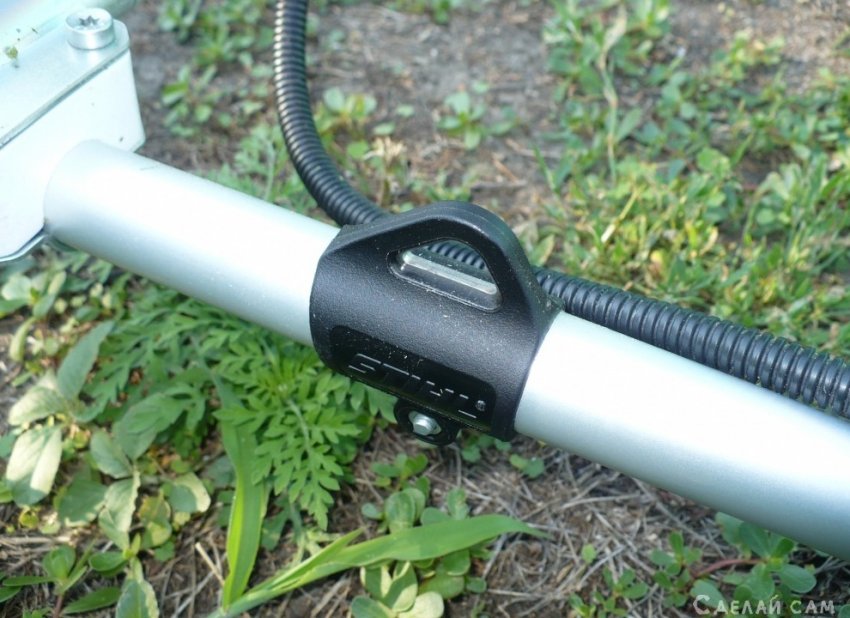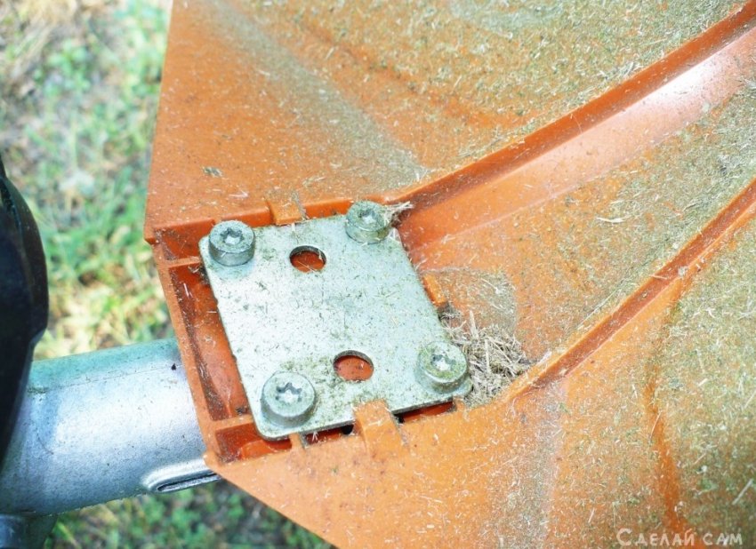 Переварачиваю косилку на рогатину и переходим к сборке и установке защиты.У этой модели она одна-для ножа и лески.После сборки защиты-сразу можно прикрутить подрезной нож для лески-так будет удобней.