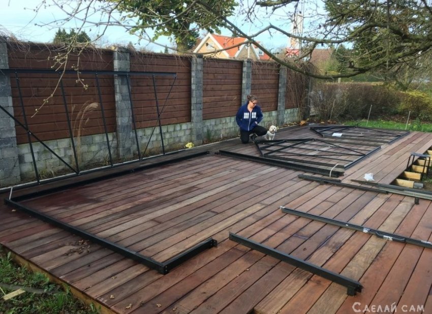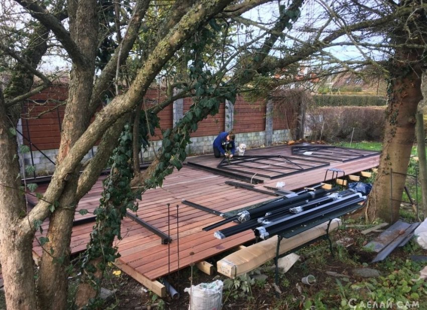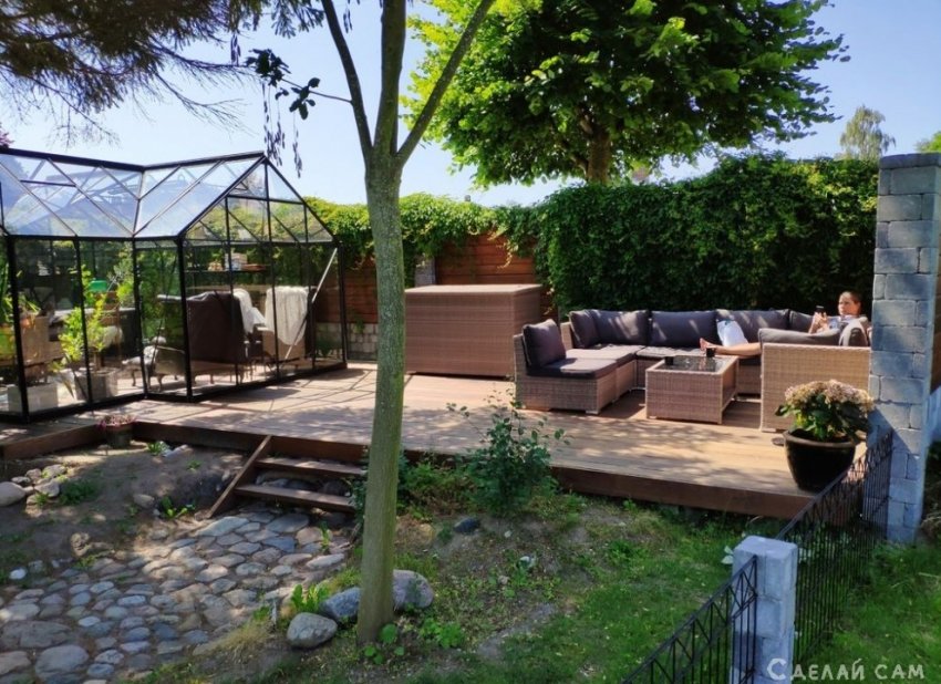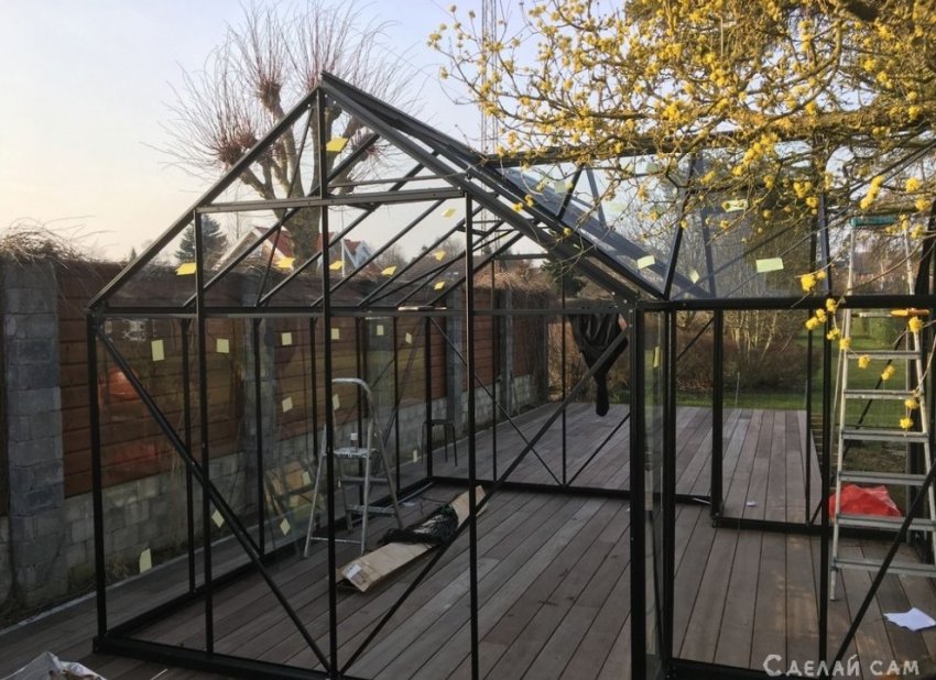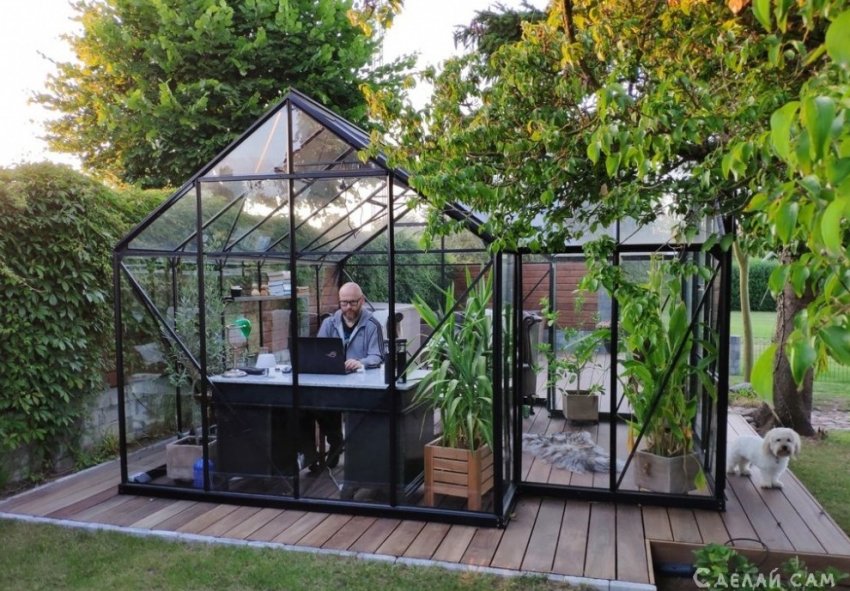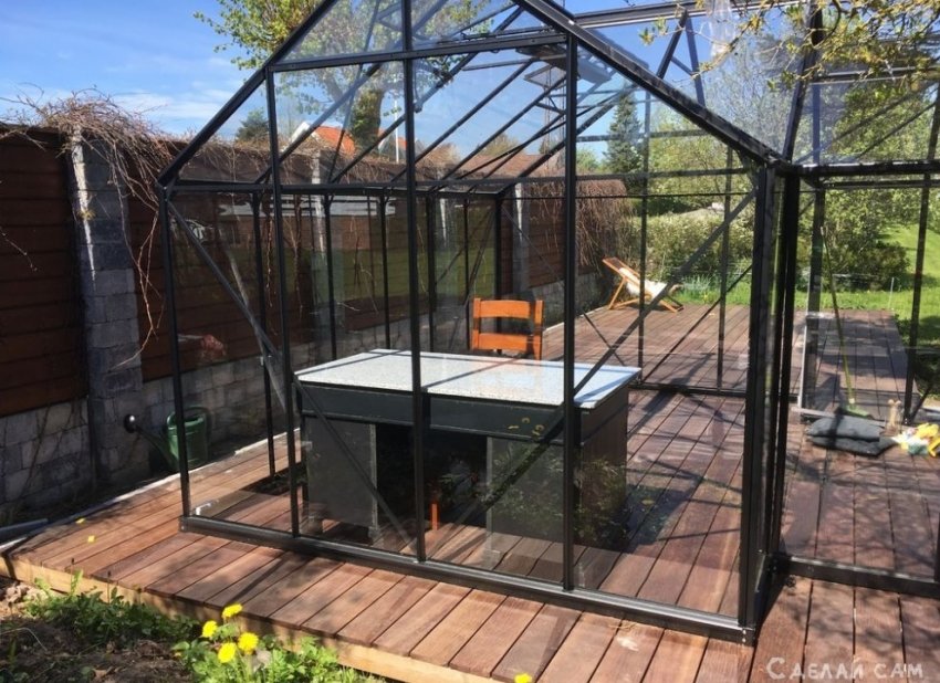 Сразу отвечу на некоторые вопросы. Стеклянную часть специально разместили под деревом, что бы тень максимально прикрывала рабочую зону. Стекло - износостойкое, не боится ударов града/яблок и т.д.