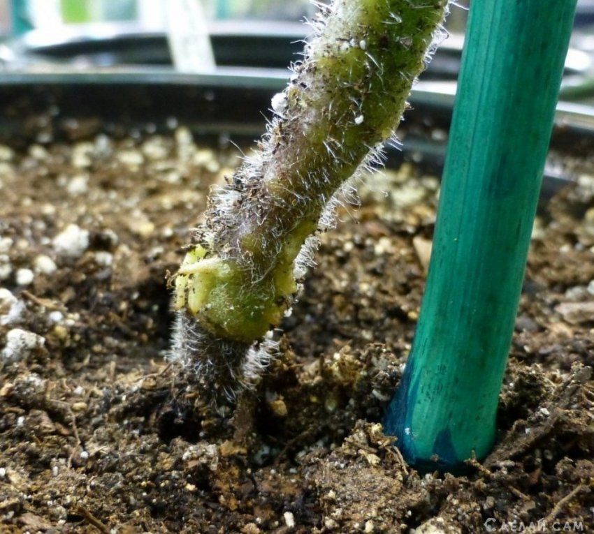 Четвертым назовем корневую гниль. В народе ее называют черной ножкой. В почве очень много влаги. А может, почва сильно удобрена. Вот именно эти причины и вызывают это заболевание. Вначале корни чернеют, а потом сгнивают. Для профилактики помидоры поливают 2-3 раза каждые 30 дней раствором бордоской смеси.