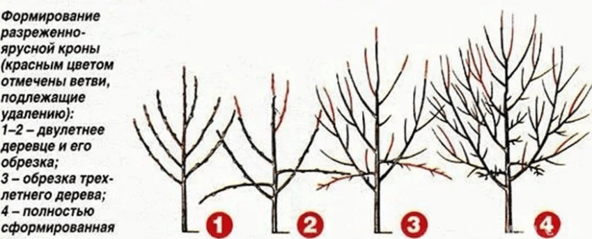 Весеннюю обрезку проводят после окончания весенних заморозков. Обрезают отмерзшие из-за холода ветви. Крону необходимо формировать не слишком густой. При недостатке солнечного света плоды внутри кроны могут не созреть. Высота дерева должна быть не более 2,5 метра. Слишком высокие деревья дают плохой урожай, быстро истощаются и погибают. Обязательно следует обрезать ветви, растущие высоко вверх.