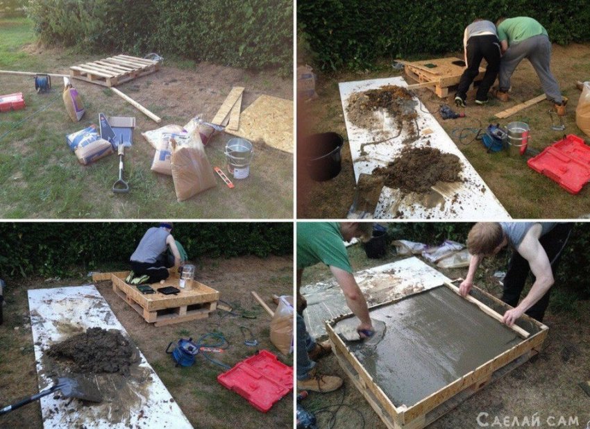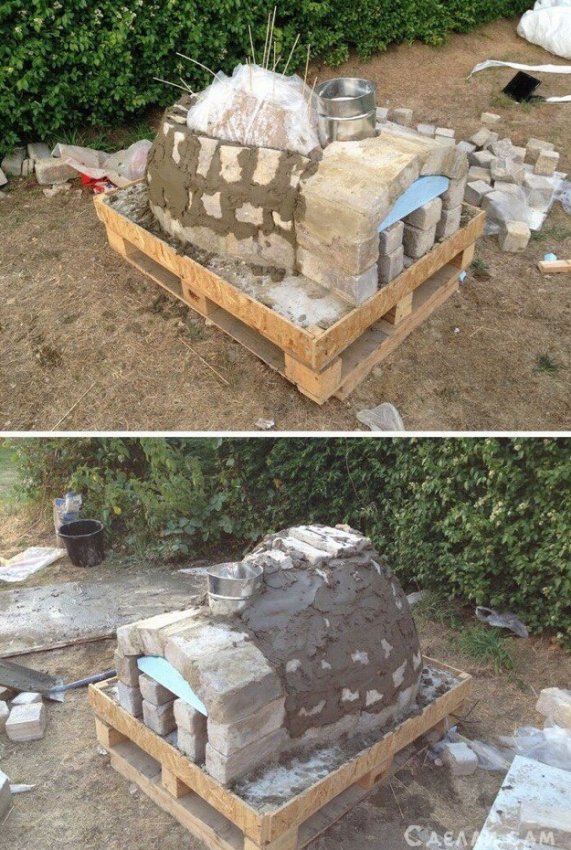 Первым делом, мы залили основу - бетонную плиту. Так как в теории, печь должна переноситься, сделали опалубку прямо на деревянном поддоне. Плита толстая, поддон не подвергается горению/нагреву.