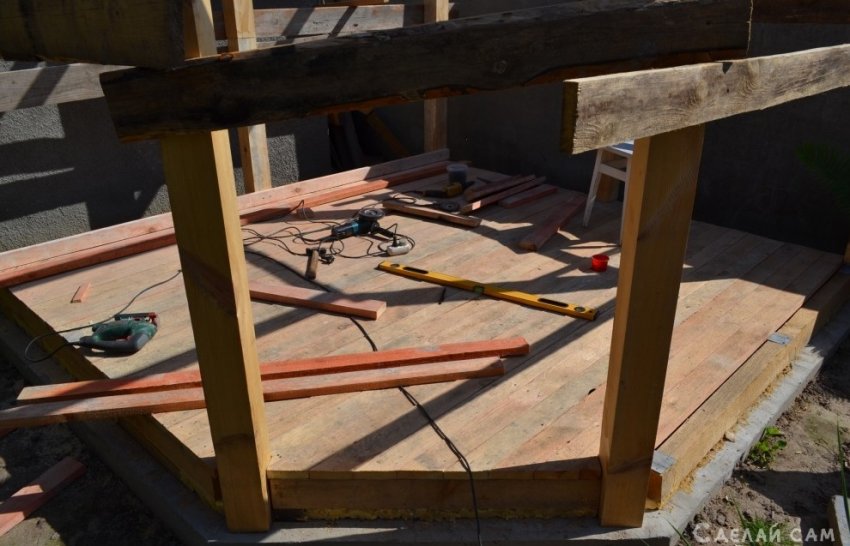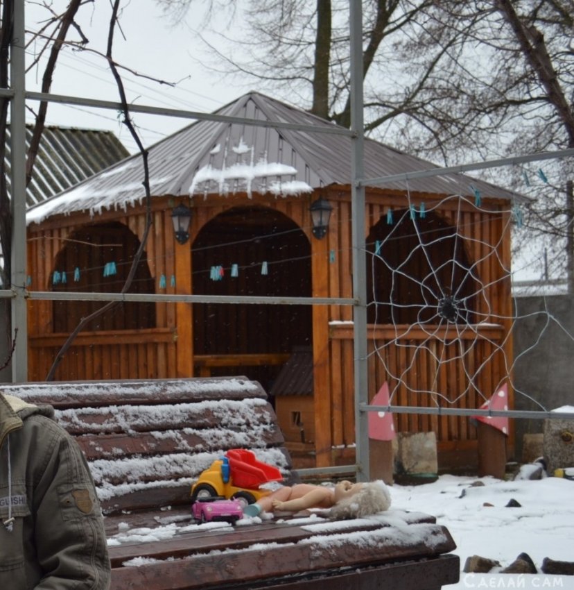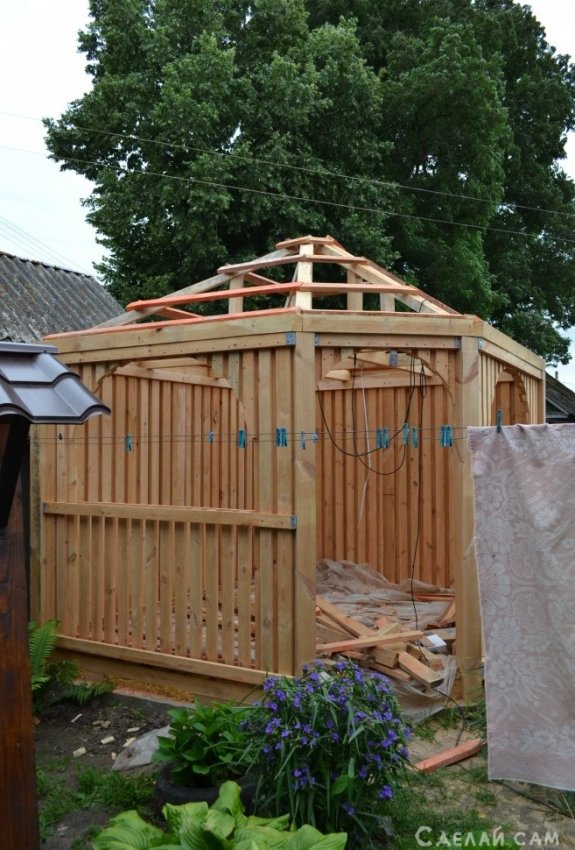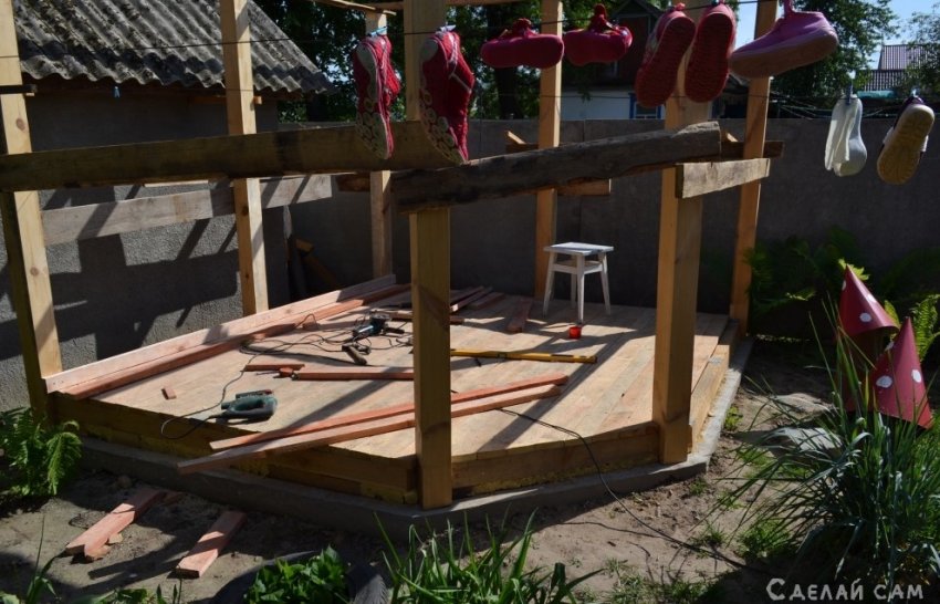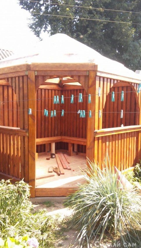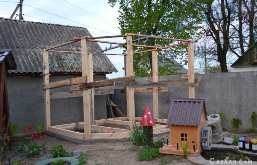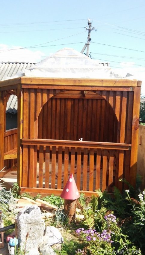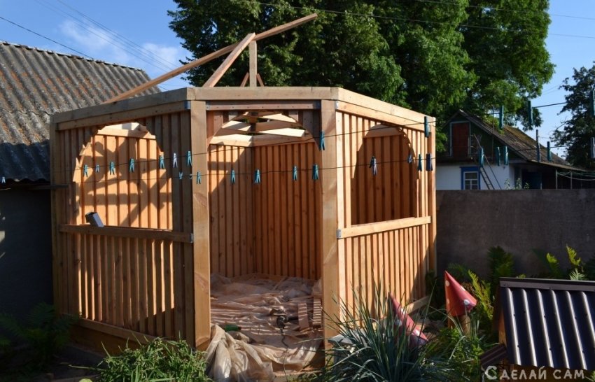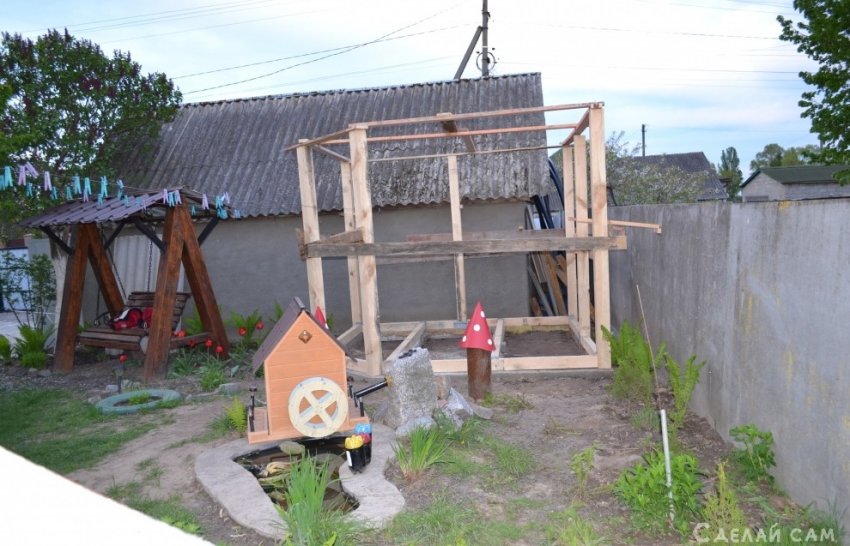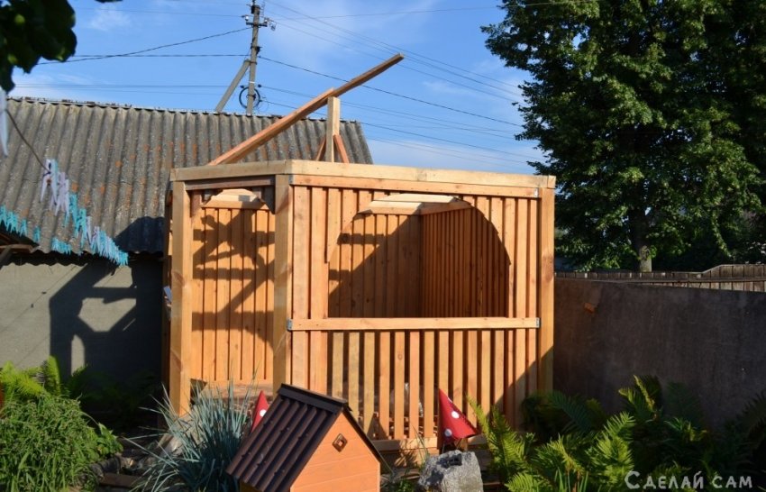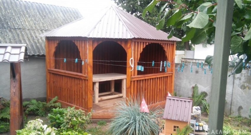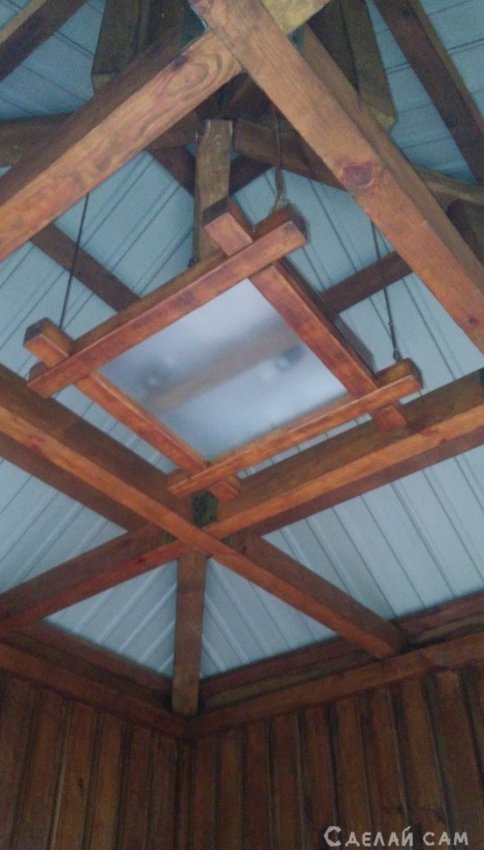 Хотів покрити металочерепицею, багато відходів (не вписувався в бюджет), покрив металопрофілем, провів проводку на внутрішнє і зовнішнє освітлення, розетку, зробив стіл