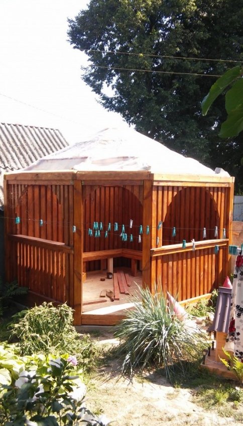 Накинув плівку на дах, почав покривати лаком, пішло в 2 рази більше розрахованого