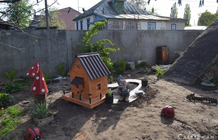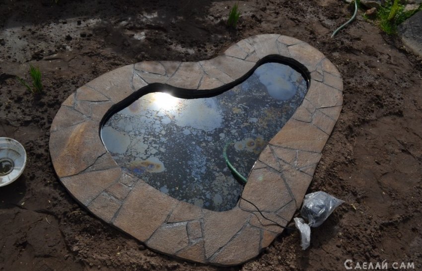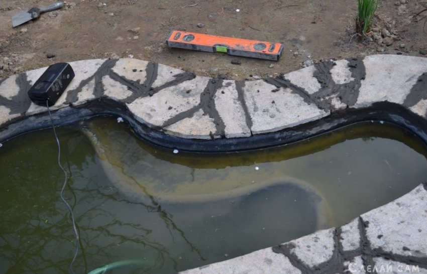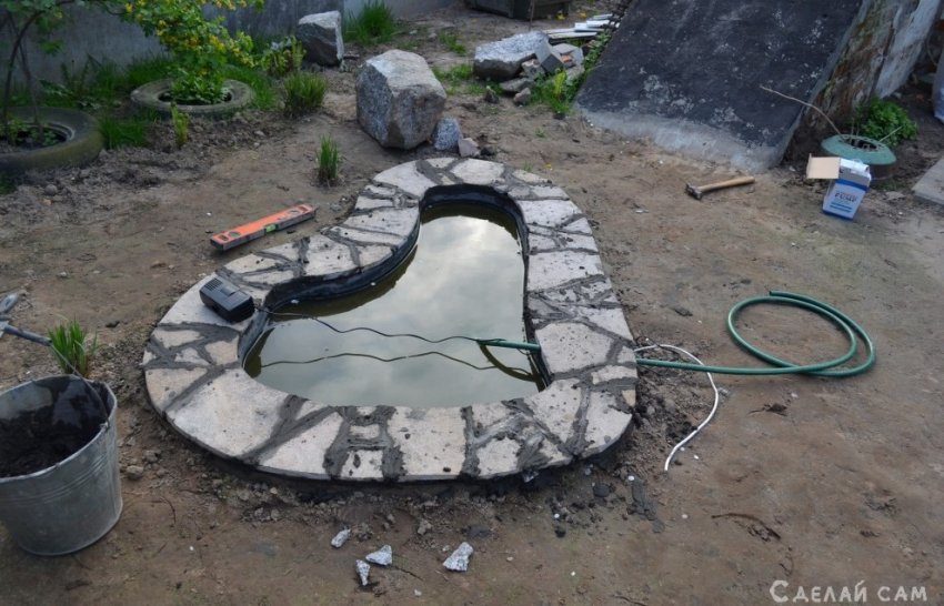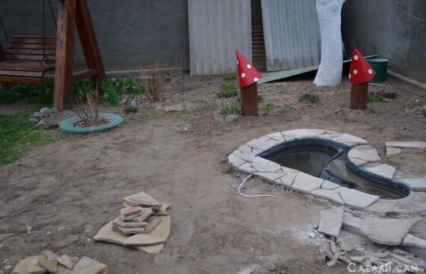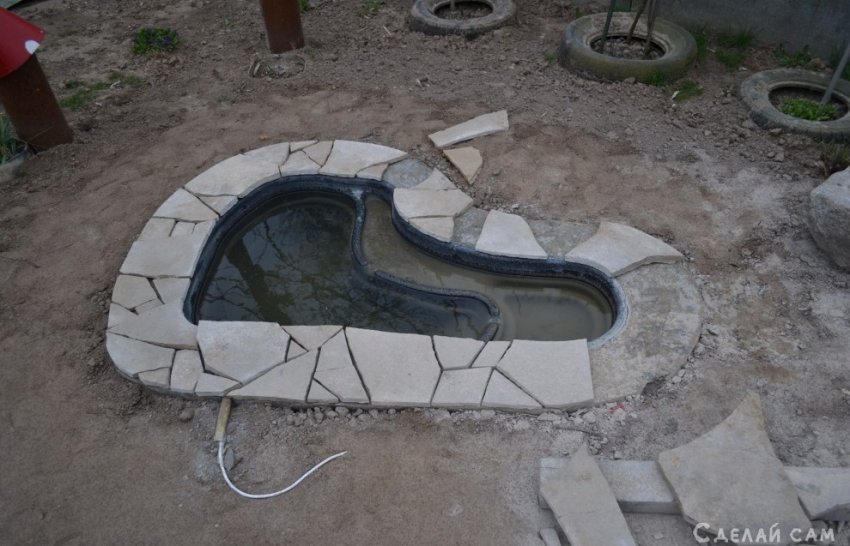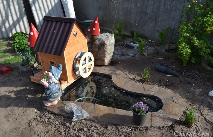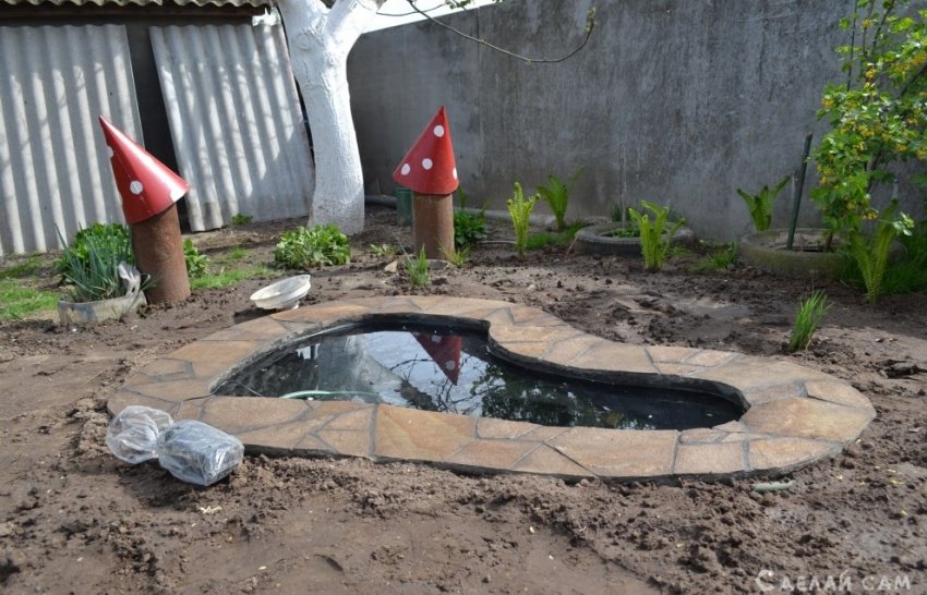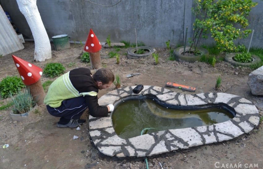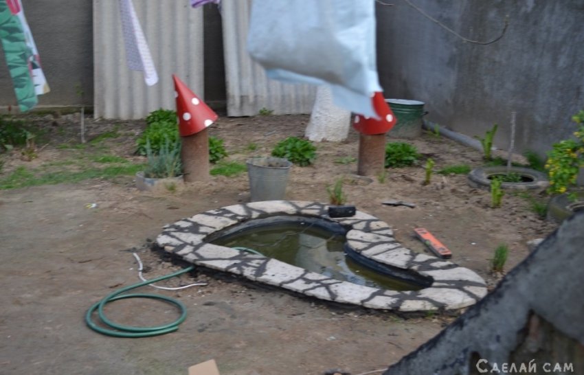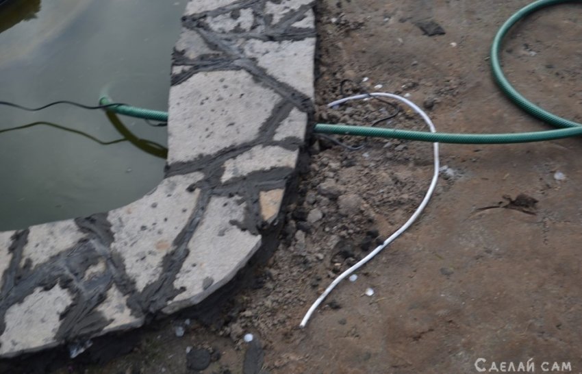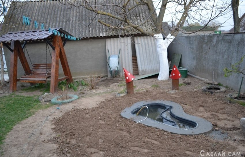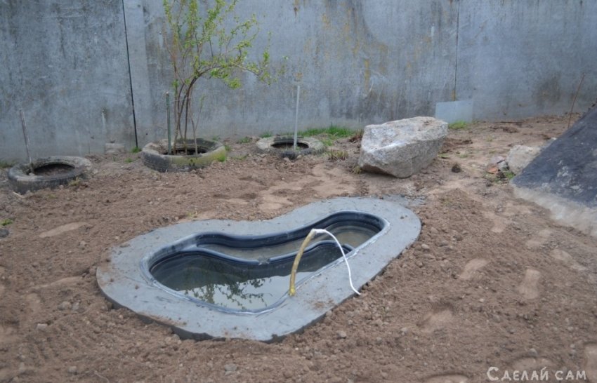 Паралельно купив готове пластмасове садове озеро на 140 л, вкопав і зробив бетонну відмостку, провівши кабель живлення, для майбутнього насосу