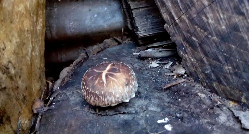 А вот и первый шиитаке, мы и их немного посадили, сейчас там ещё несколько.