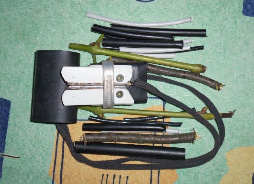 Второй(а) вариант: всё тоже самое что и в предыдущем варианте, единственное что с целью защиты плодов от повреждений надеваем на основание пхв термоусадку а на лезвия ножей пластиковые накладки плюс на металлический хомут одеваем кембрик.