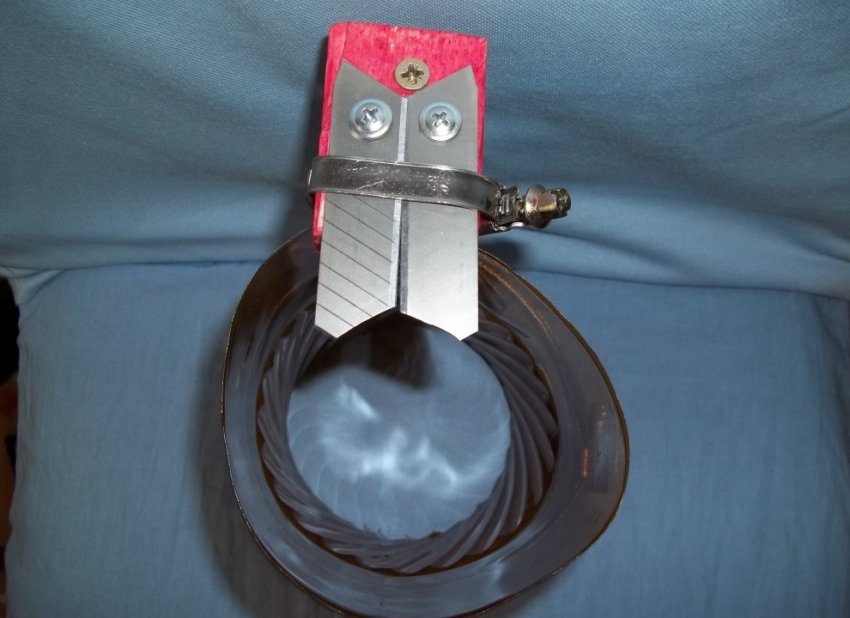 Второй вариант: берём деревянную(пластиковую) основу размер 55*40*10 мм ( Д*Ш*В) на расстоянии 10 мм от края в середине бруска сверлим отверстие, меньшего диаметра чем саморез, которым мы его крепим к основанию насадки (Т П). После этого закрепляем, на основании 5-7 мм отступив от просверленного отверстия, обойные ножи ( расстояние между ножами подбирается опытным путём, вовремя съёма фруктов). Концы лезвий ножей обламываем (опиливаем) по форме английской буквы v так чтобы плодоножка попав между ними, некуда не делась. При желании на кончики лезвий можно на клей посадить пластиковые или резиновые трубочки это можно сделать как в первом, так и во втором варианте. И в заключении собранную нами конструкцию скрепляем хомутом он придаст жёсткость модели, а при помощи винта появится возможность регулировать расстояние между лезвиями.