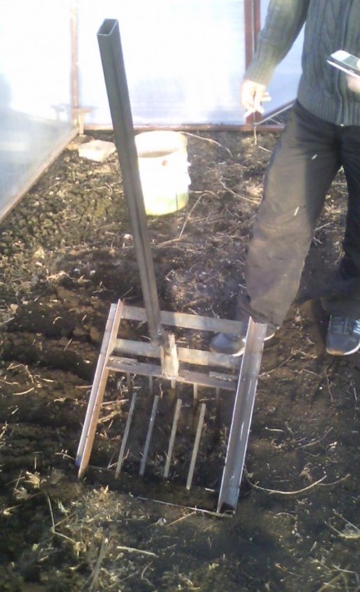 Поехал пробовать в сад. земля ещё не оттаяла на улице. ну а в теплицу втыколось на весь штык. Скорость легкость и удобство порадовали. с виду выглядит тяжелым ( вес около 5-6 кг) а в работе её поднимать то особо не надо. передвигай по земле да топой ногой.