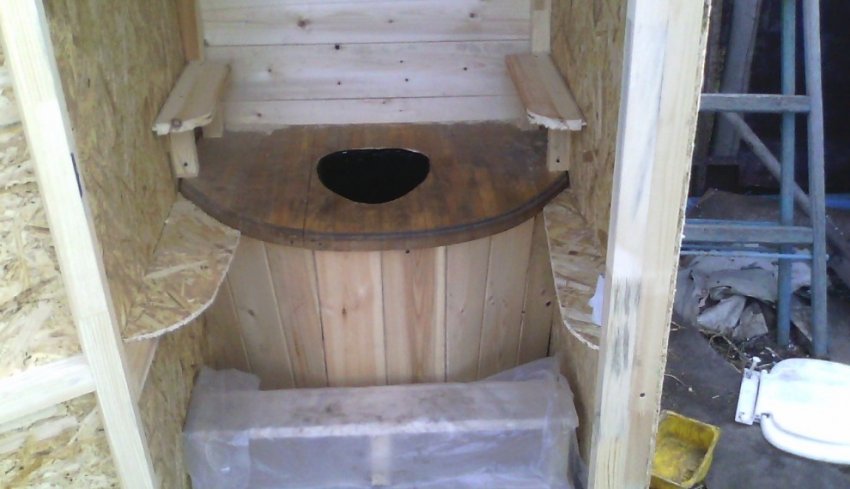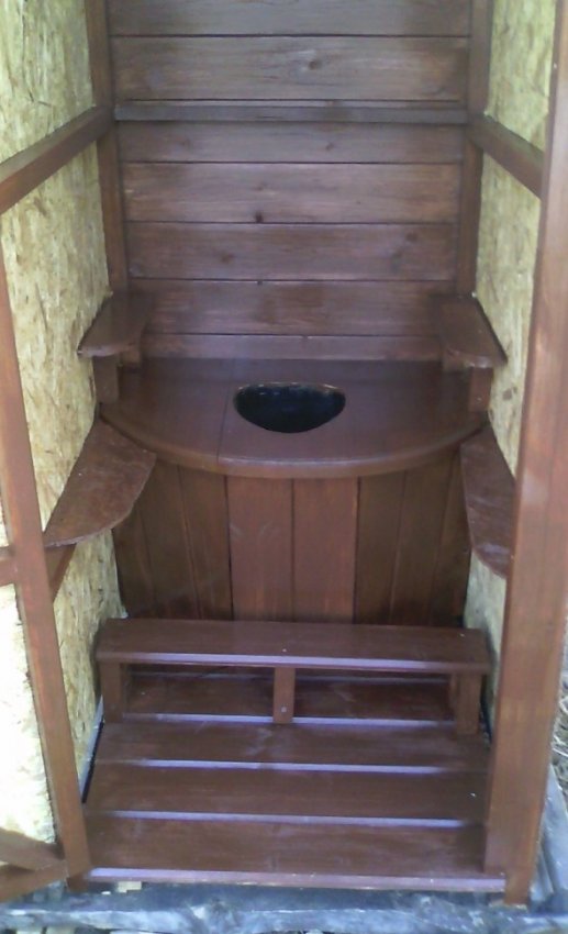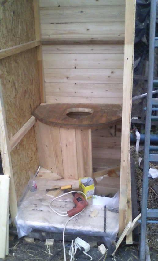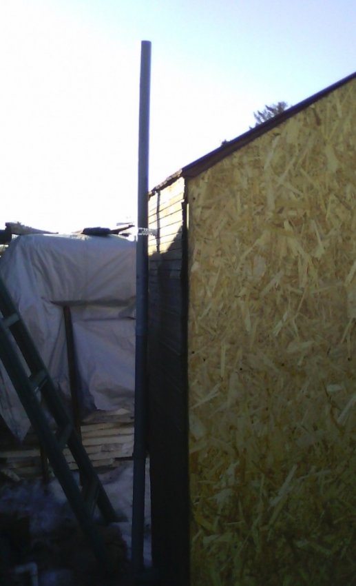 Внутри сделал рукав из бигроста(рубироида) до самой ямы и под троном сделал отверстие в задней стенке под канализационную трубу d50мм.и протянул трубу с отводом под 90* по задней стенке(для вентиляции), выше крыши (для тяги),так что думаю будем без ароматов.