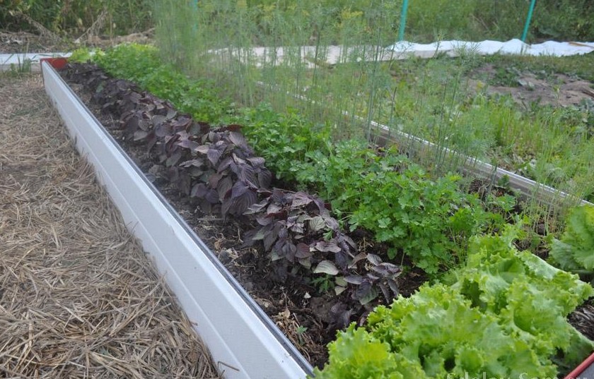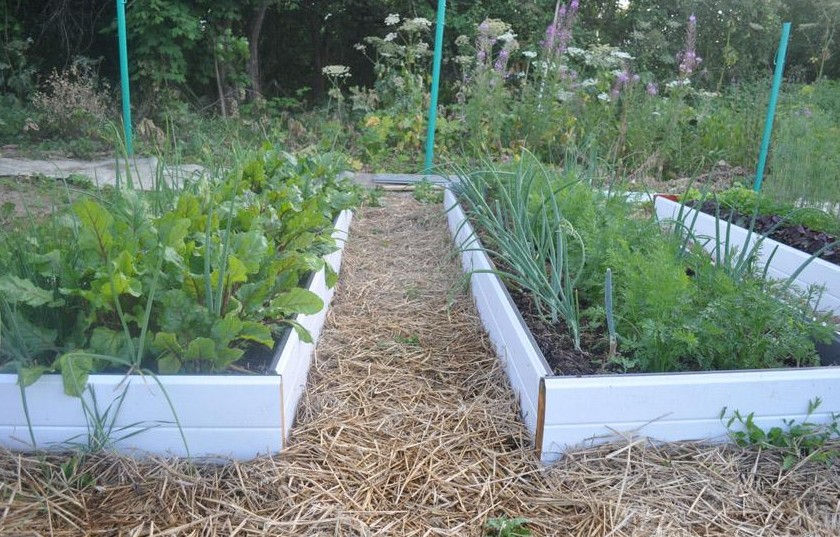 Из обрезков сэндвич-панелей (знакомые отдали - осталось от строительства) собрала на уголках короба без дна. Расставила их на картон. Землю не экономила, междурядья около метра, чтобы удобно было ходить, при желании поставить скамеечку и полоть сидя. Широкие междурядья - не только удобно, но и для растений хорошо - им достается больше света. На дно коробов накидала подвяленых сорняков и насыпала хорошего компостного грунта. Посеяла семяна, посадила рассаду. Дорожки застелила соломой. За лето многолетние сорняки на грядках не появились. На дорожках кое-где вылез вьюнок - но очень тонкий и слабый - выдернуть его не составило труда. Когда растения на грядках подросли, почву вокруг них замульчировала соломой - этот прием экономит влагу и сильно подавляет рост сорняков, полоть практически не приходится - пробиваются отдельные расеньица лебеды, которые легко удаляются. Все выполотые сорняки оставляю здесь же, на грядке - разлагаась, они снабжают овощи дополнительным питанием. Главное, чтобы сорняки были выдернуты вовремя - до цветения и плодоношения, иначе их семена попадут в почву. Вот какой огородик у меня получился