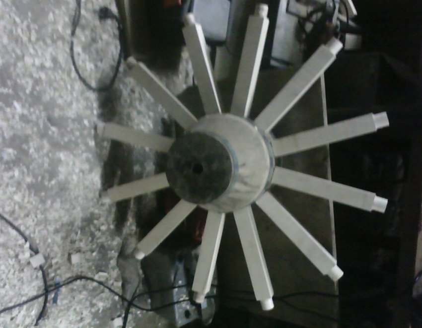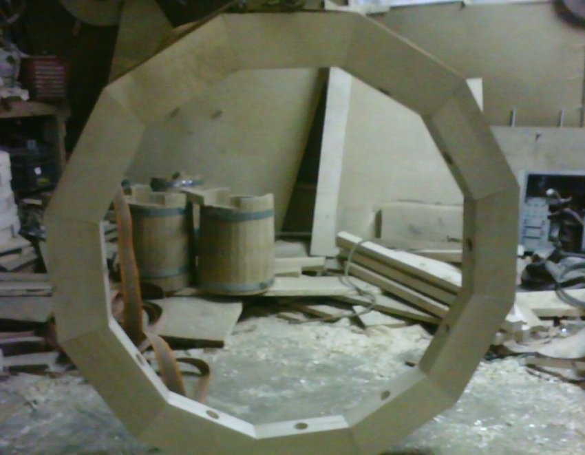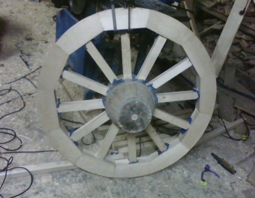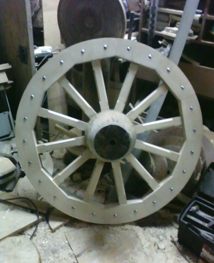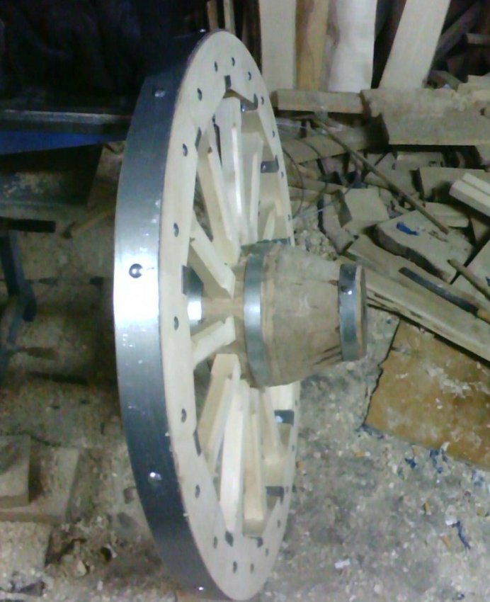 По окончании сборки округлый вид колесу придан при помощи фрезера. Колесо оковано оцинкованной сталью 4 мм.
