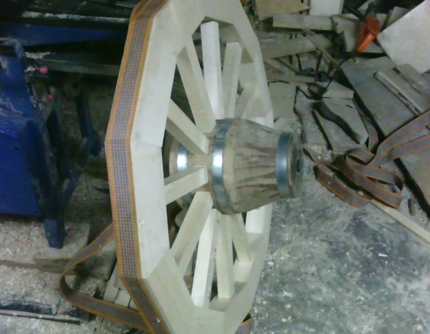 Для придания колесу прочности края секторов закреплены между собой металлическими вставками и стянуты болтами.