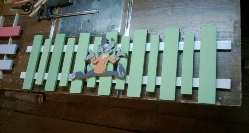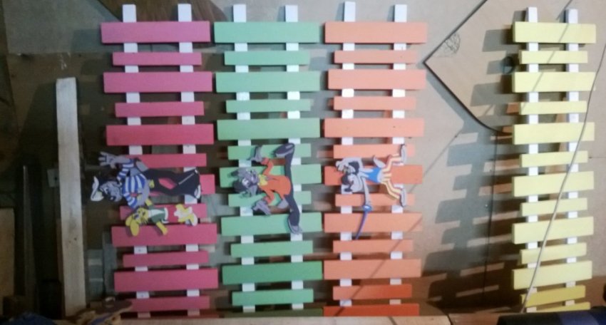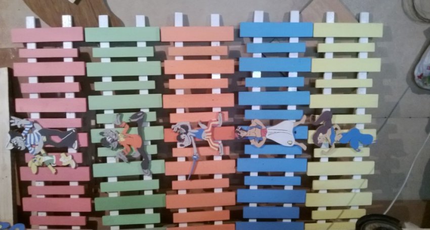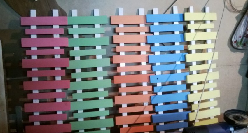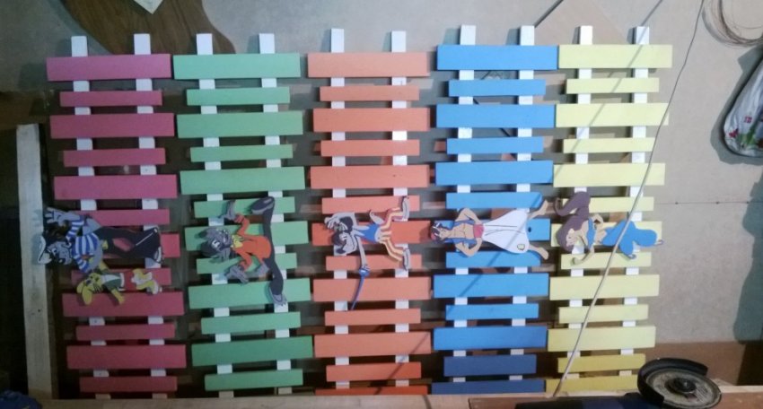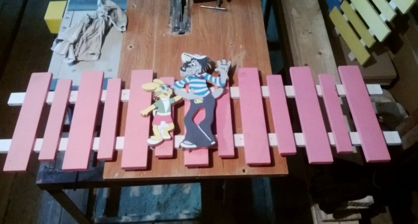 Идея сделать заборчик из детсва пришла спонтанно , просто как-то увидив женчину которая фотографировала своего ребёнка у разных фигур возле кафе промелькнула мысль а не сделать ли что то простое но не обычное и красочное, так и возникла идея . Сделать такой забор очень просто нужно всего лиш желание и время . Напилить досок отшлифовать , покрасить , вырезать фигуры из ДВП раскрасить .