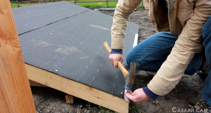 Крышу делаем на земле, потом поднимаем, и устанавливаем по месту.