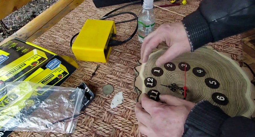 Выжигателем делаем кружки чтобы выделить цифры на спиле и приклеиваем деревяные цифры .