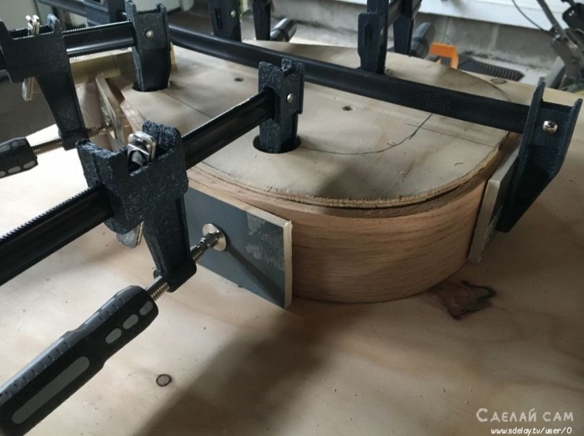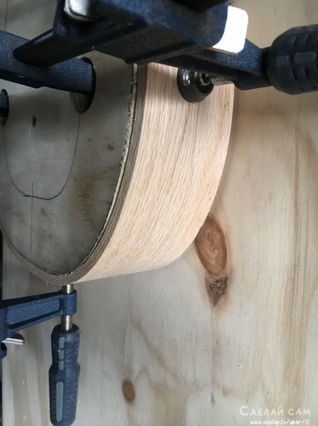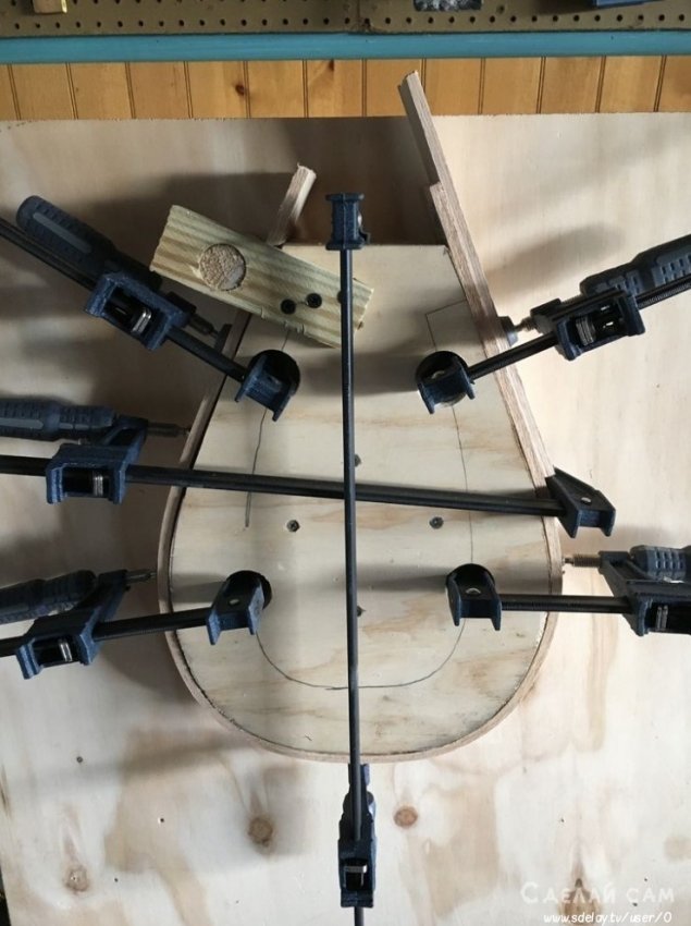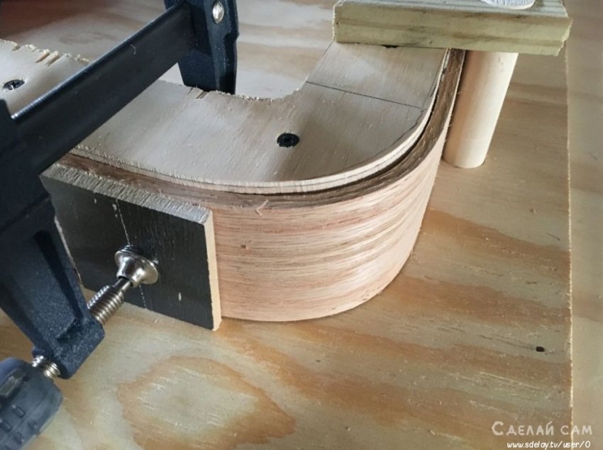 Принцип изготовления просто. Вырезаем деревянную форму (внутренней части) бокала. После чего, увлажняем древесину (фанеру). После этого, с помощью струбцин плавно и аккуратно фиксируем по контуру нашей формы.