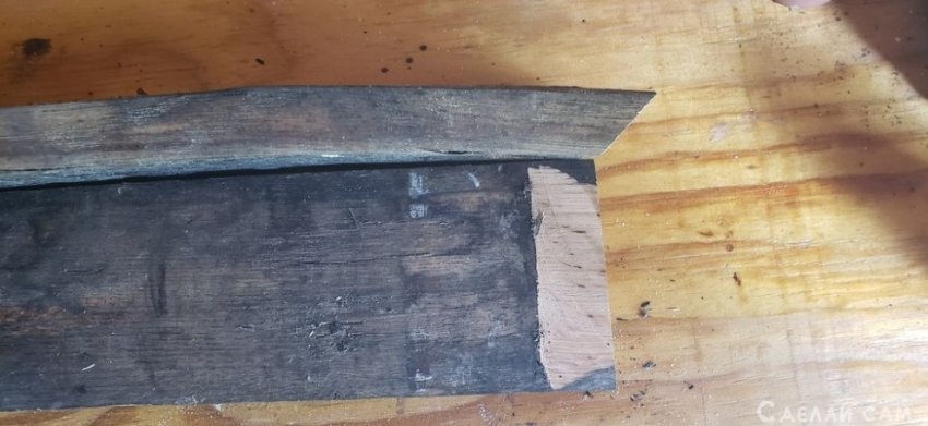 На одном из краев делаем срез, таким образом, что бы получался угол между двумя досками не более 45 градусов.