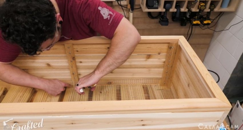 Снизу ящика, на дно, устанавливаем сетку с крупной фракцией.