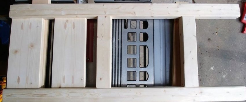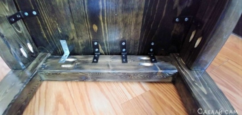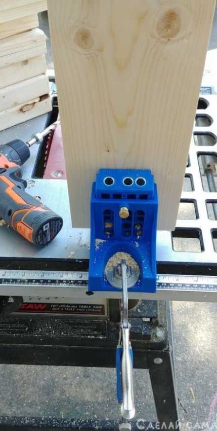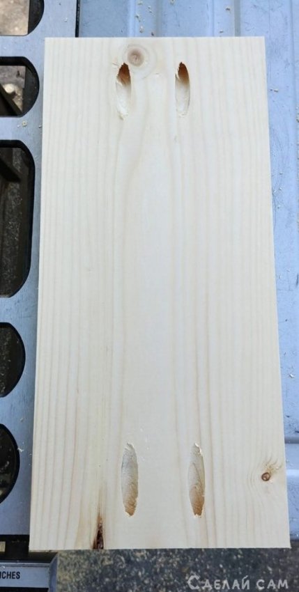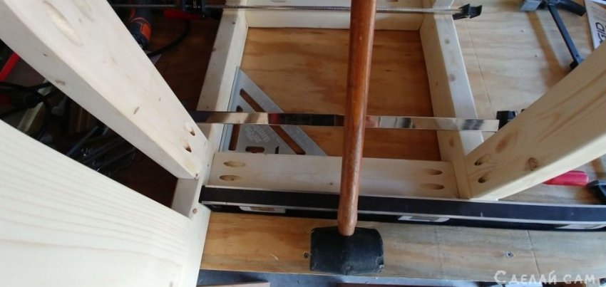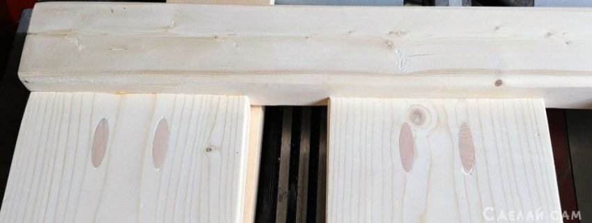 Фиксируем части на саморезы. По две точки. Главное не пережимать доски, что бы не потрескалась поверхность.