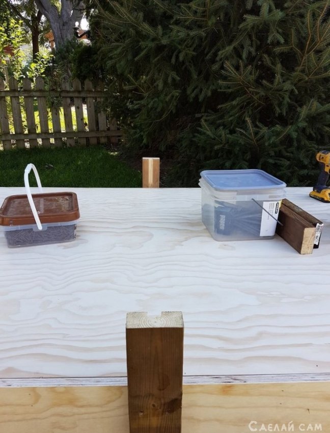 Из фанеры (толстой, листовой) вырезаем верх стола. Крепим все с помощью саморезов.