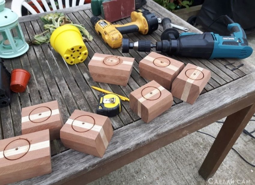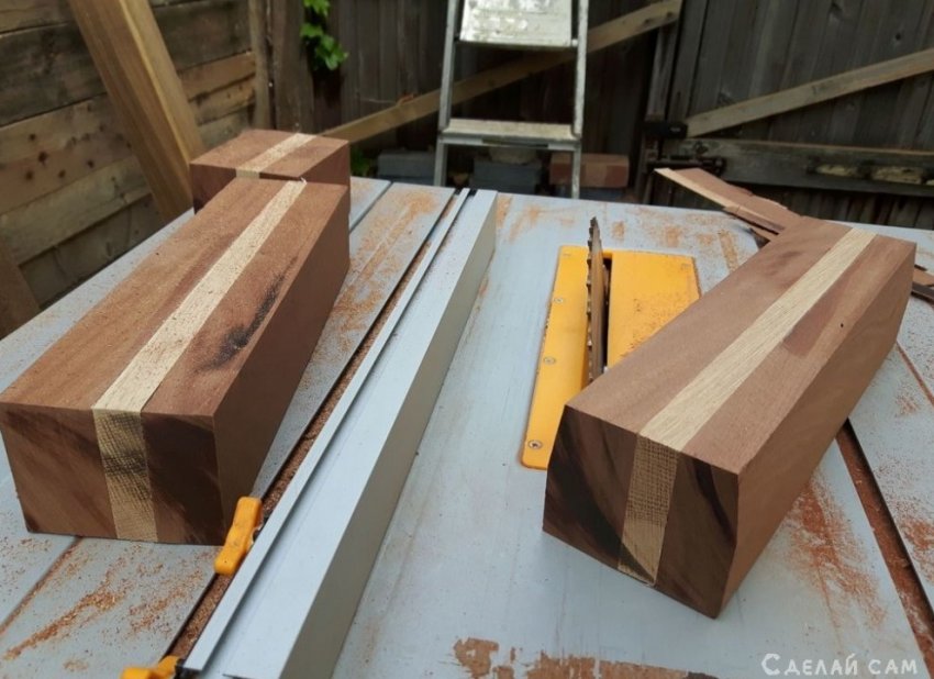 Первым делом нарезаем брусья. Я использовал два светлых бруска, один темный. Таким образом создается шахматный стиль самоделки.