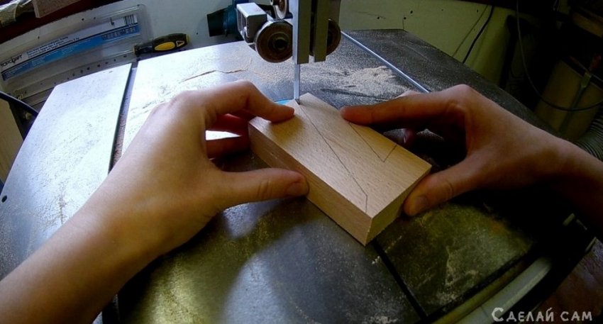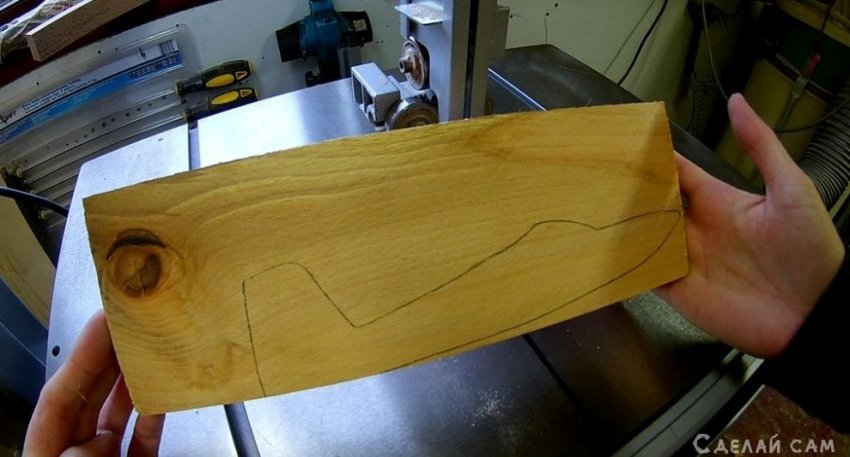 В качестве основы используем простой брусок. Вырисовываем на нем контур основы самолета, вырезаем с помощью лобзика.
