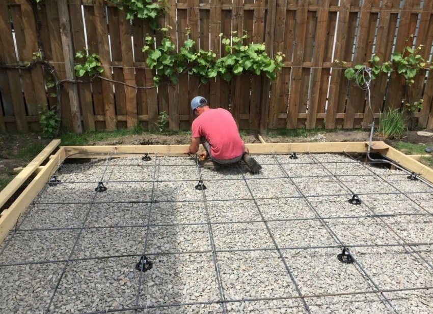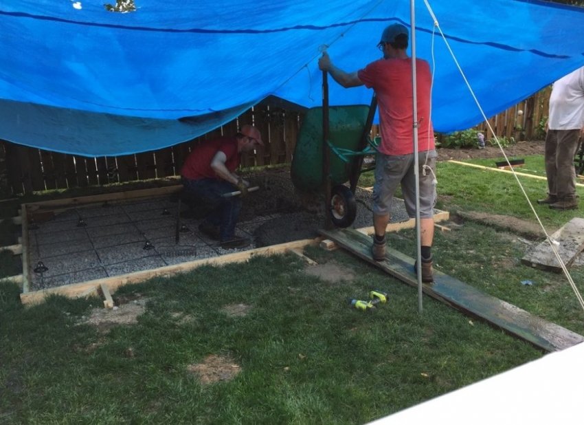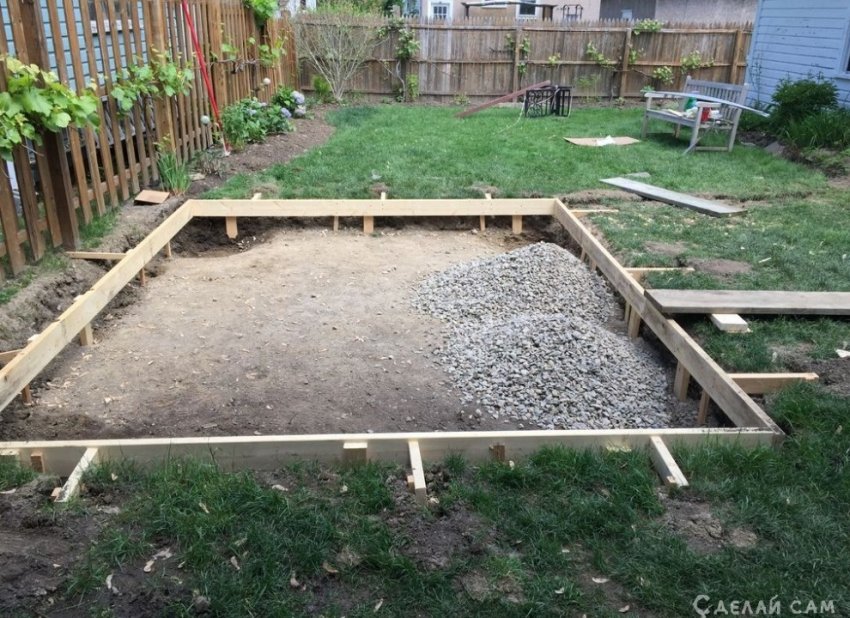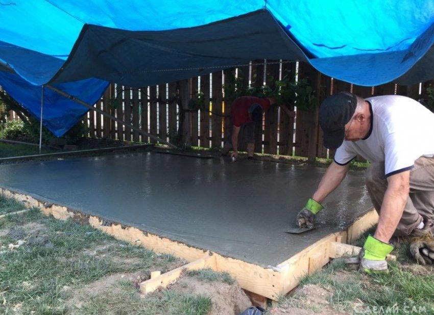 Обычная бетонная площадка. Важно дать ей просохнуть несколько дней, при этом не забывать поливать несколько раз в день, что бы не появлялись трещины на поверхности. Когда площадка просохла - устанавливаем брус (опоры).
