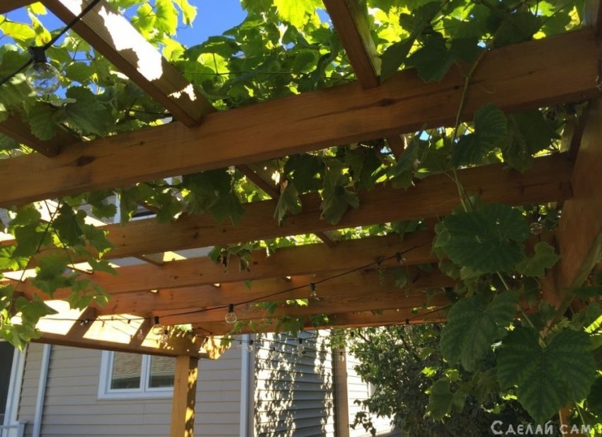 Я использовал сосну, так как она наиболее дешевая. Вот как выглядит в данный момент беседка. От дождя не защищает, а от солнца - с лихвой!