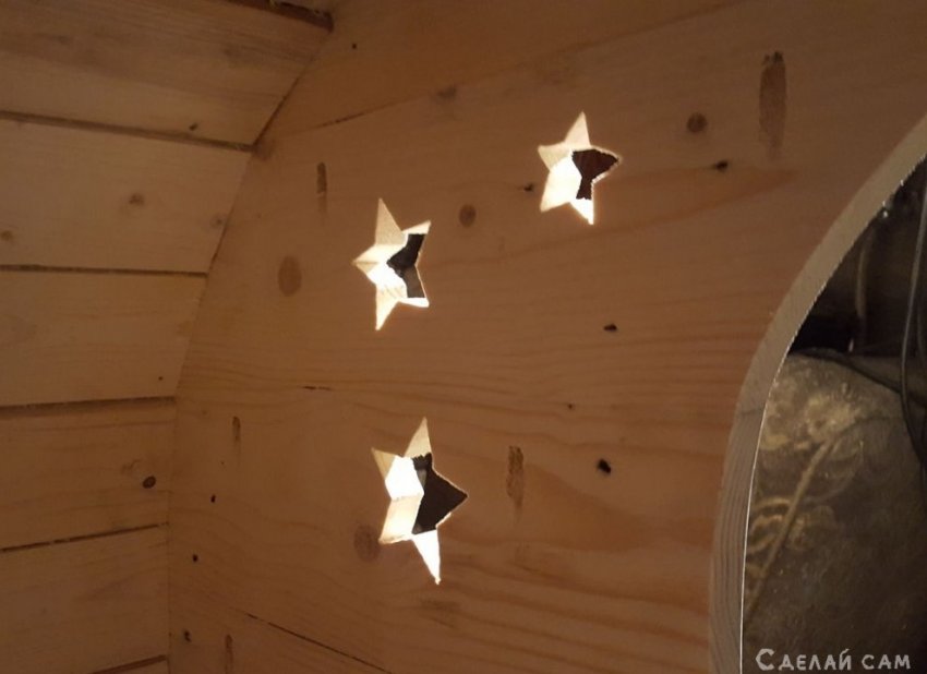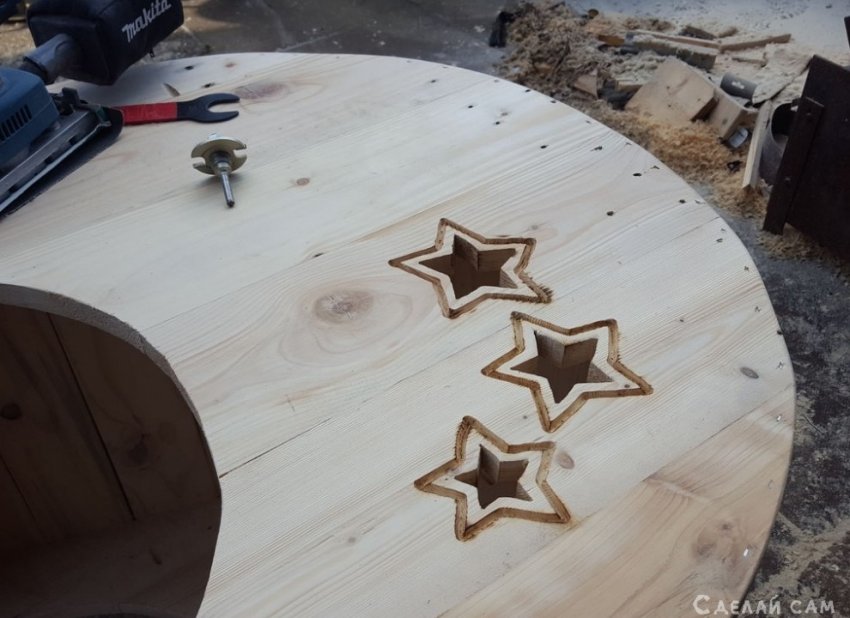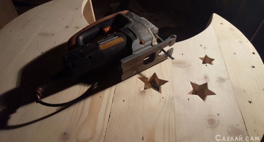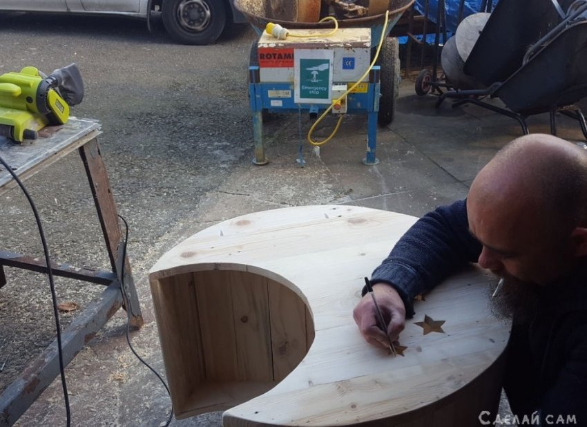 Для декора, в стенках полумесяца проделываем фигурные вырезы. Для этого высверливаем отверстия, после чего делаем вырез по контуру звезды.