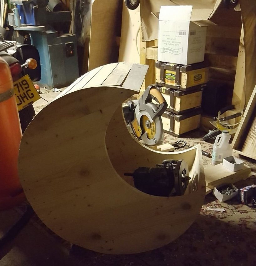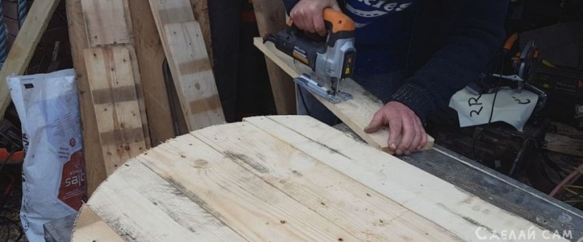 Вот собственно и весь инструмент. Для начала, разбираем старые паллеты на доски. Далее, размечаем круг. Вырезаем его. После чего вырезаем часть круга, формируя своего рода "месяц" из дерева.