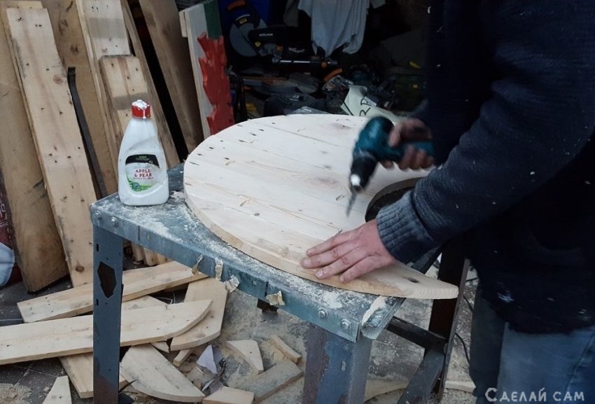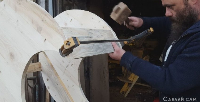 Далее, поэтапно соединяем два полумесяца между собой промежуточными досками. Для этого используем саморезы. Закручиваем их постепенно, что бы конструкцию не повело. Помните, что дерево не идеально ровное. Возможны неровности.