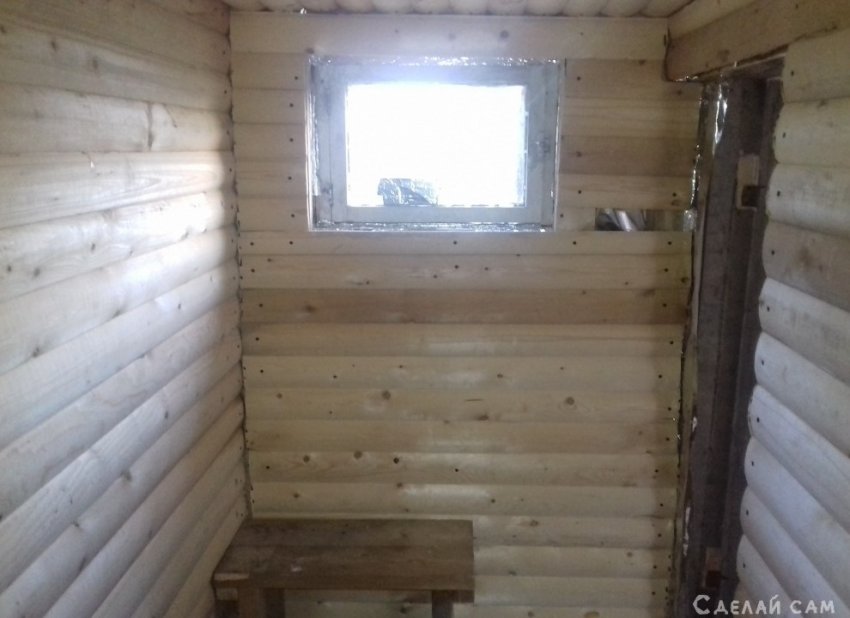 Обшиваем все деревянной вагонкой. Вышло очень даже похоже на баню :)