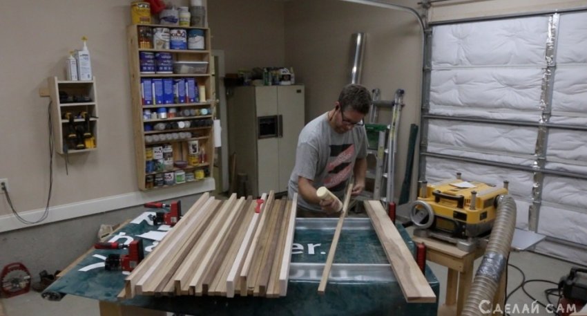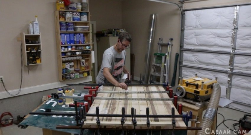 Далее проклеиваем рейки между собой. Сжимаем зажимками. Даем скрепиться и просохнуть, примерно двое суток.