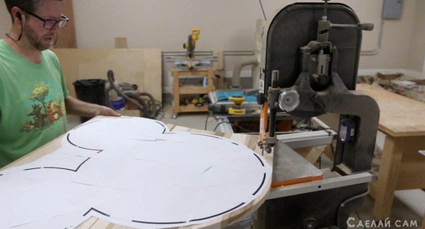 После этого, шлифуем плиту, убираем все неровности. Форма у нас будет необычной. В виде силуэта диснеевского мики мауса. Я разбивал изображение вручную, печатал на А4 и склеивал части. Но, в принципе, можно разбить рисунок на 2 листа А1 и распечатать в копи центрах.