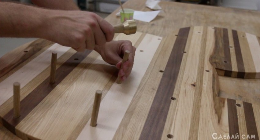 Размечаем на поверхности места крепления вешачков. После чего, высверливаем канавку, и вбиваем туда круглую реечку соответствующего диаметра. Для фиксации, в лунку предварительно заливаем клей.