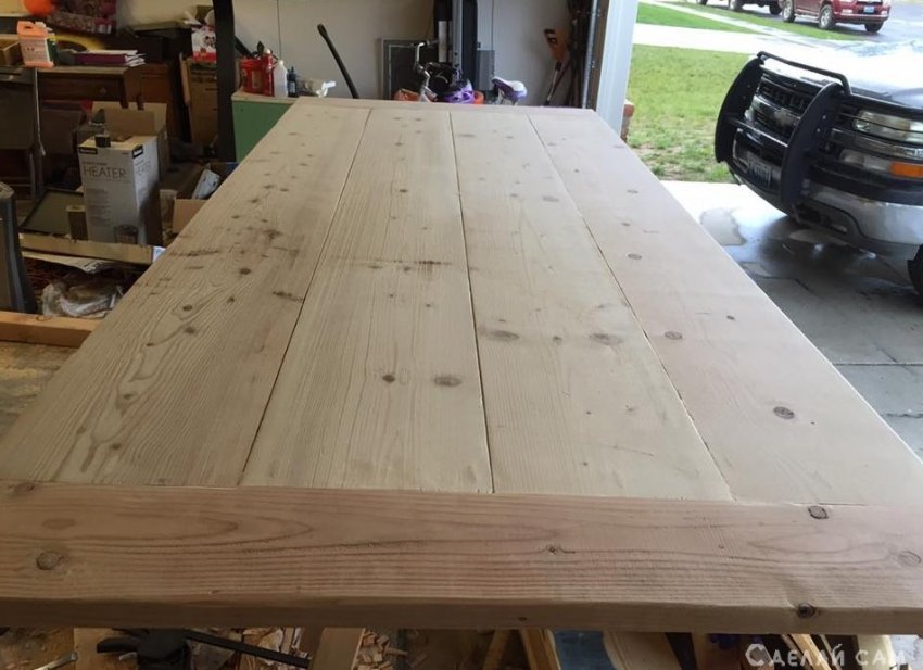 Между осями должно пролагать 3 доски, к которым прикрепится столешница. Так как стол большой, необходимо позаботиться об опорах.