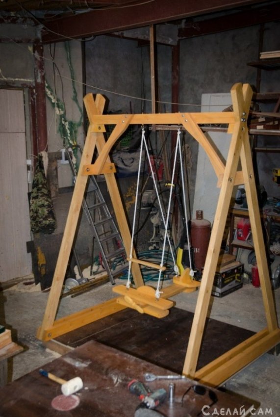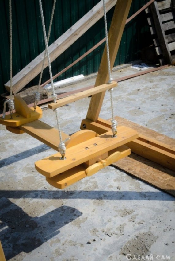 Хочу показать вам, как можно сделать необычную качель своими руками. Для этого нам понадобится обычные деревянные бруски, доски. Сам каркас качели был сделан достаточно давно. Оставили только крючки, для качели. Делать обычную качель для ребенка не хотелось. Было принято решение сделать качель в виде самолета своими руками.