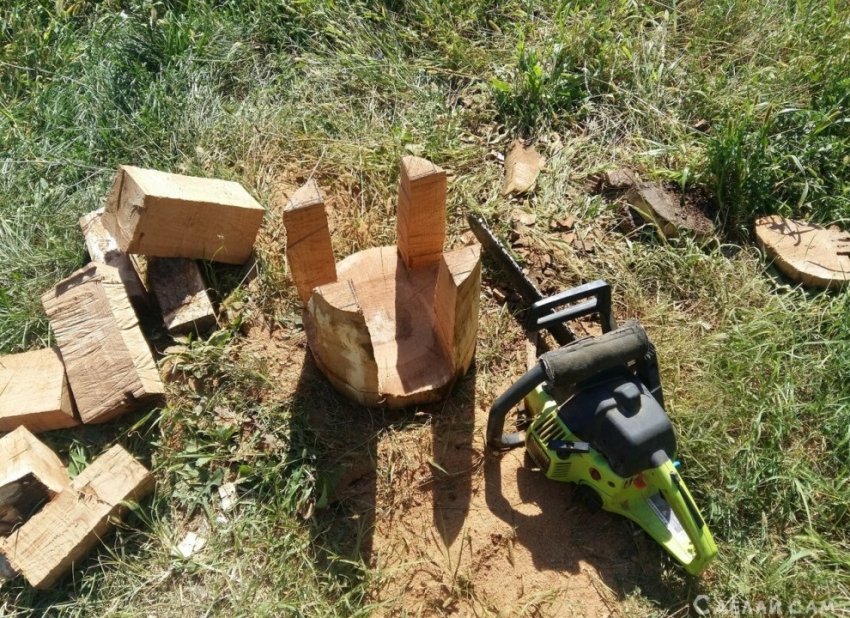 Из самого простого пня можно сделать надежный табурет своими руками. Все что для этого нужно - сухой пенек, бензопила, топор, пила. Не пренебрегайте специальными защитными очками, для защиты глаз от опилок и другим элементов. Вырезаем из пня средину крестообразную. Зачищаем дерево.