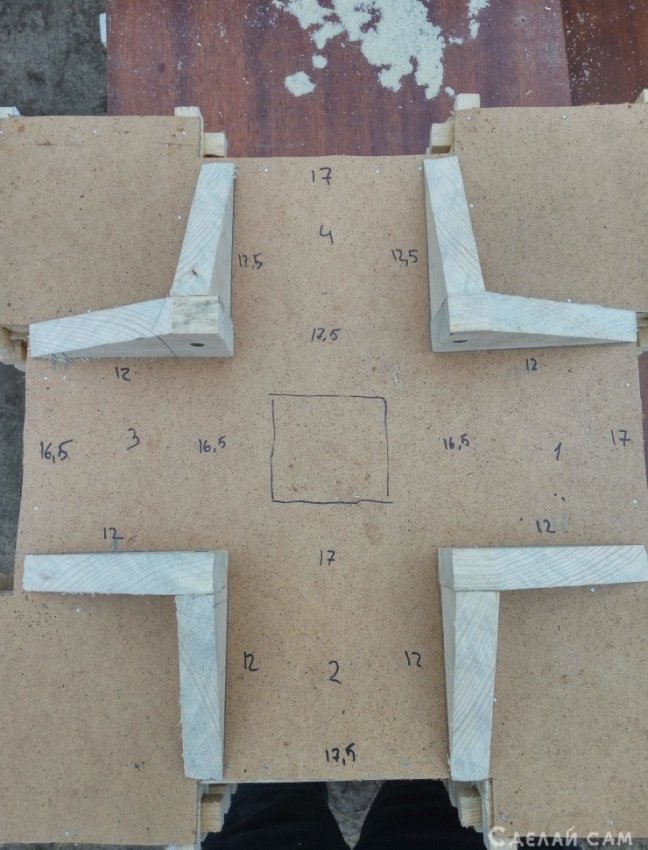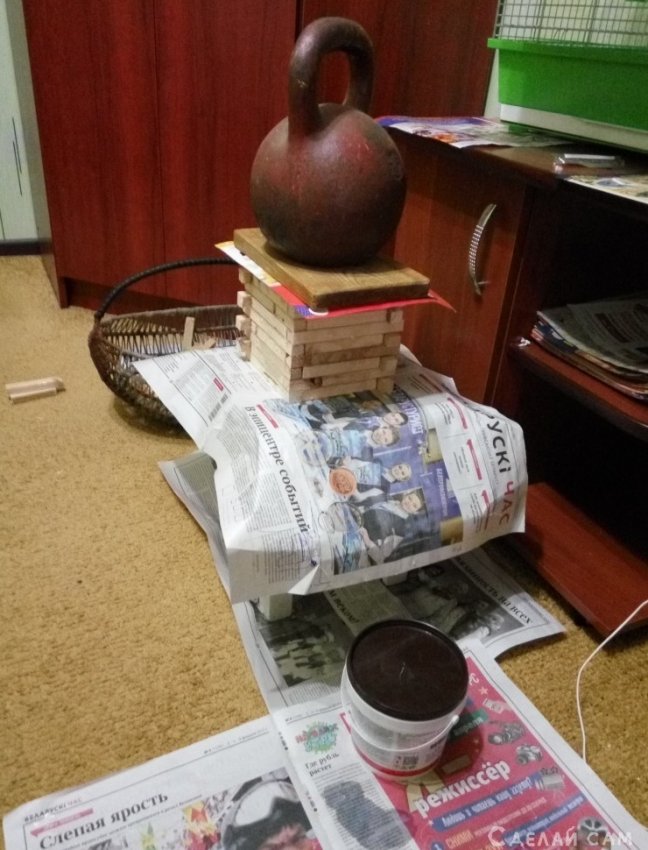 Основа - рейки, крепились с помощью клея. Всего было сделано 4 "будки". В качестве пресса использовалась гиря. Не зря столько лет хранили :D