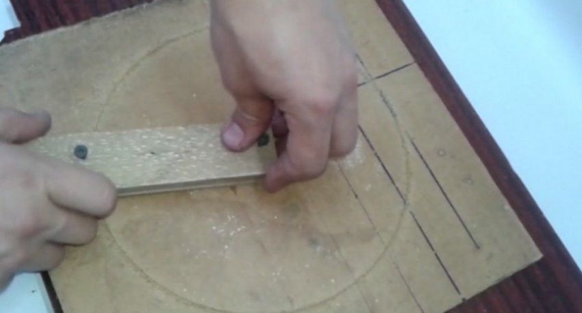 Диаметр будущего отверстия делим пополам и ставим две отметки на кусочке деревяшки.