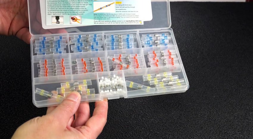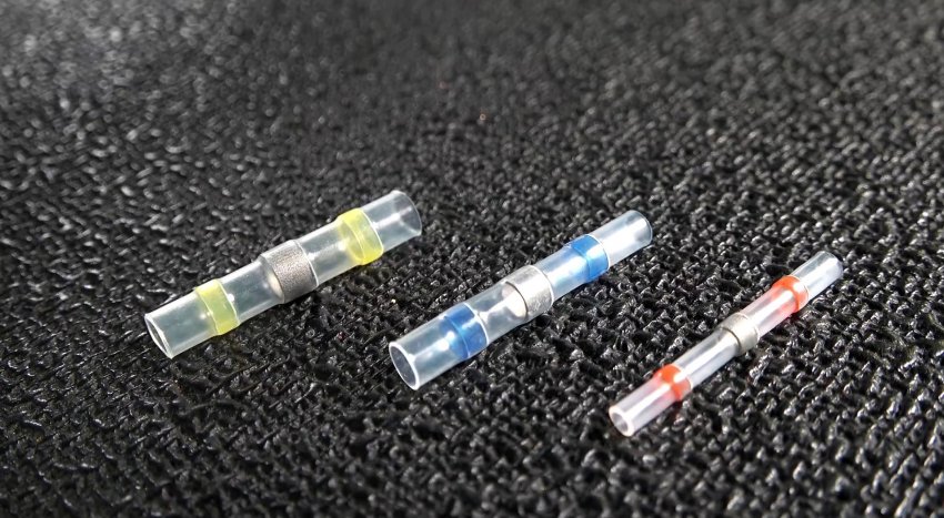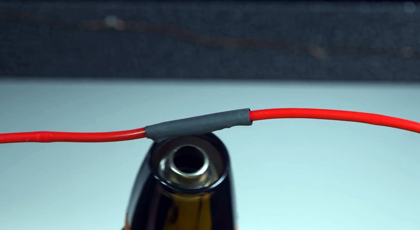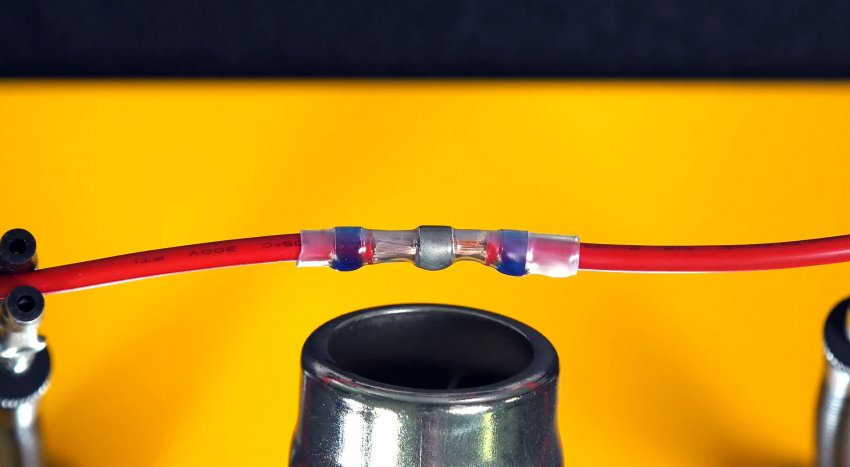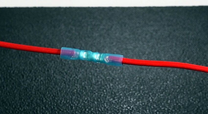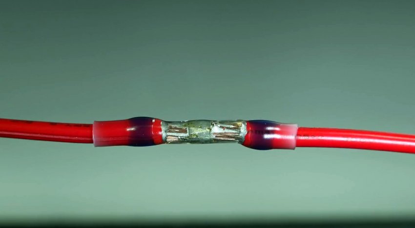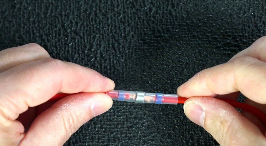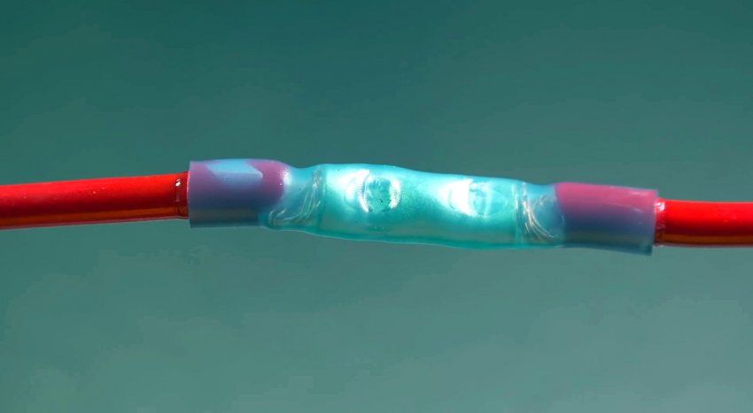 При нагреве феном термоусадка сядет, при этом припой в центре спаяет жилы, а кольца клея с боков обеспечат стопроцентную водонепроницаемость соединения.