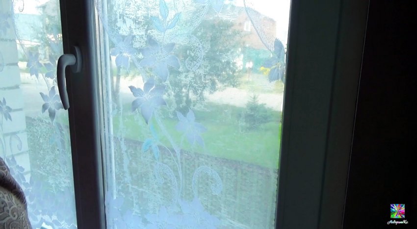 Тюль отжимается, после чего просто приклеивается к стеклам. В местах, где он не держится, нужно приглаживать рукой смоченной в крахмале.