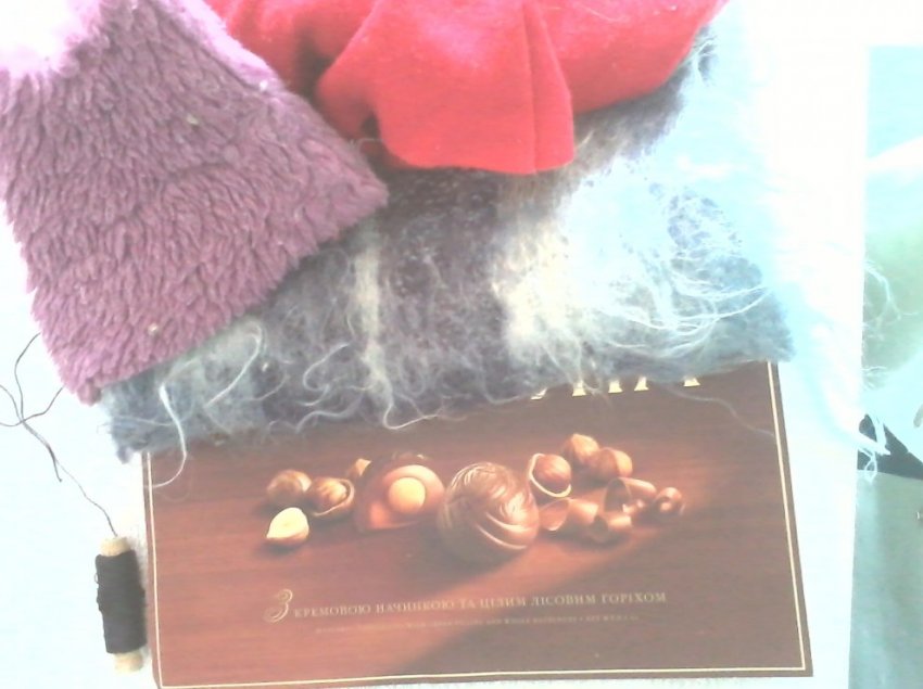 Старый мохеровый шарф сложила вдвое и приметала к картонке - это слой утеплителя, обрезала вровень с картоном