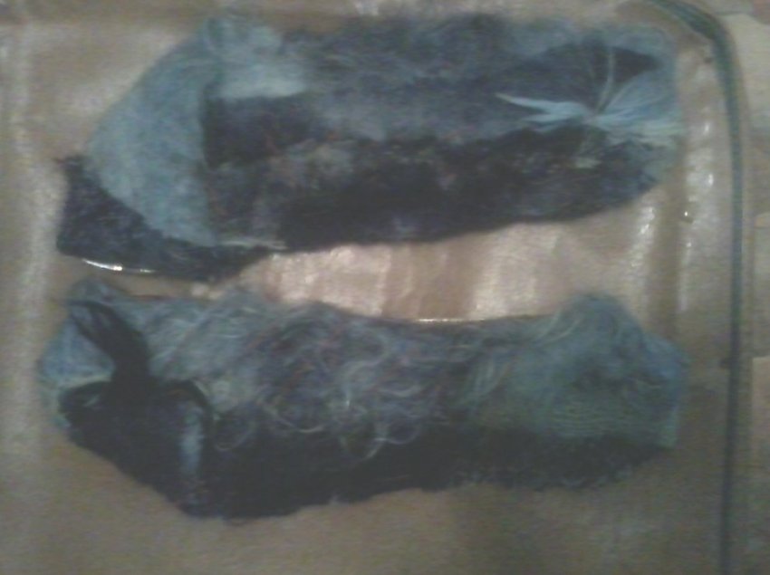 Для пошива стелек были использованы: картон от конфетной коробки, старый мохеровый шарф, кусочки искусственного меха, толстая шерстяная юбка, толстые нитки. и, конечно же, ножницы и иголка