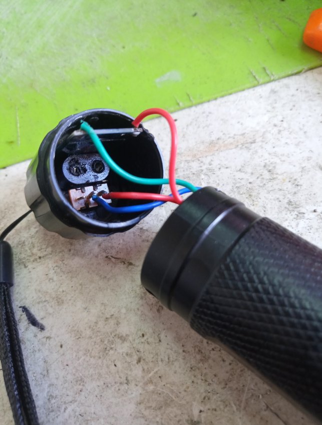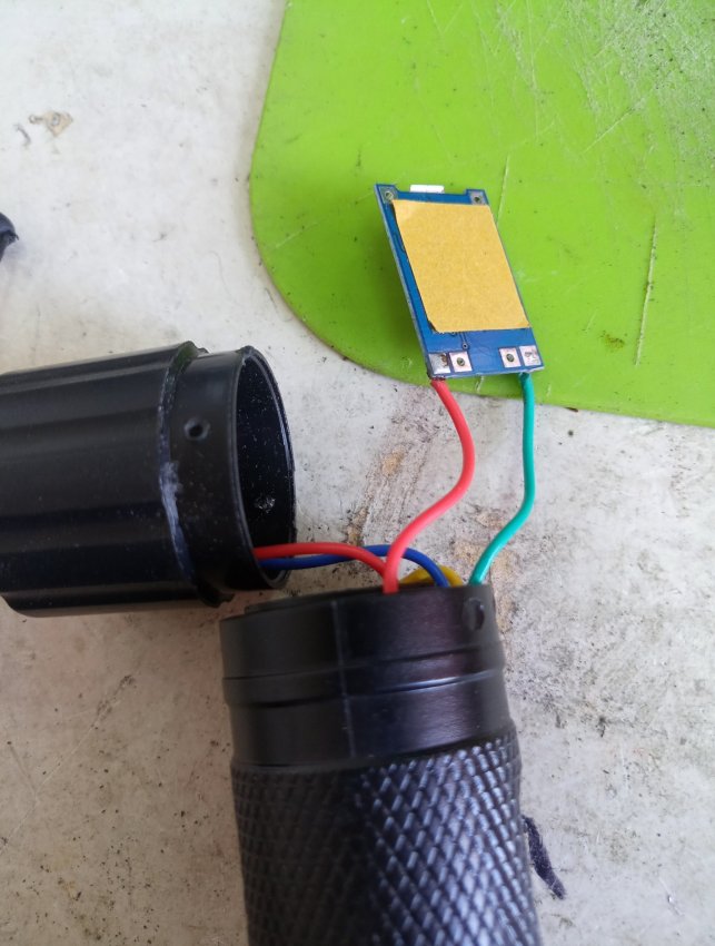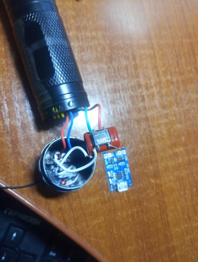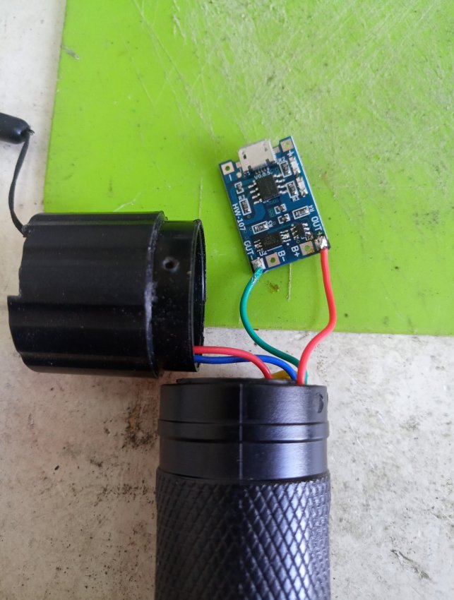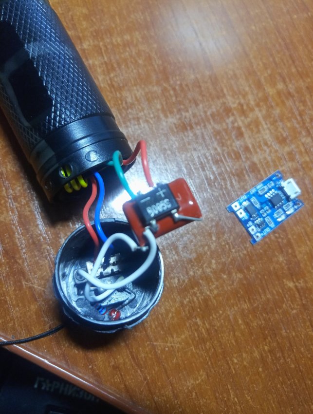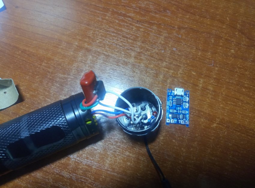 Плата зарядки на место светодиода влезает в корпус. Красный провод это плюс, а зеленый минус аккумулятора.