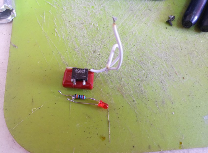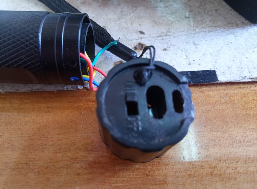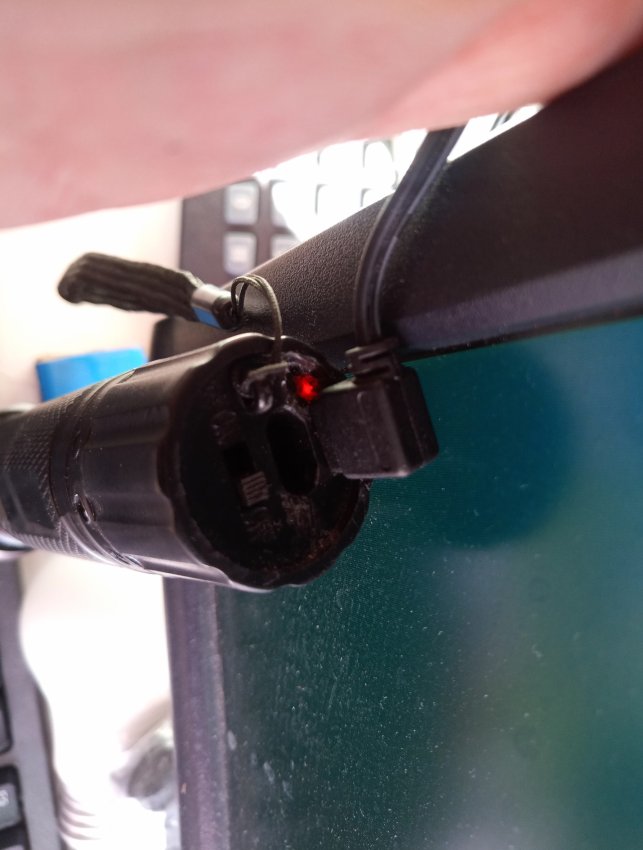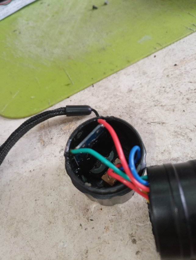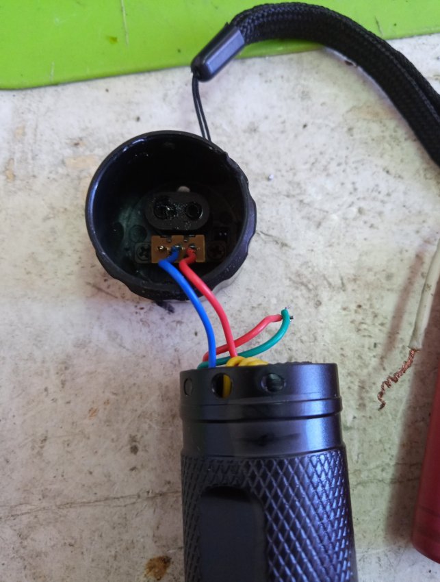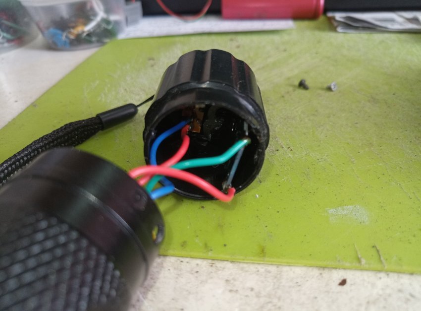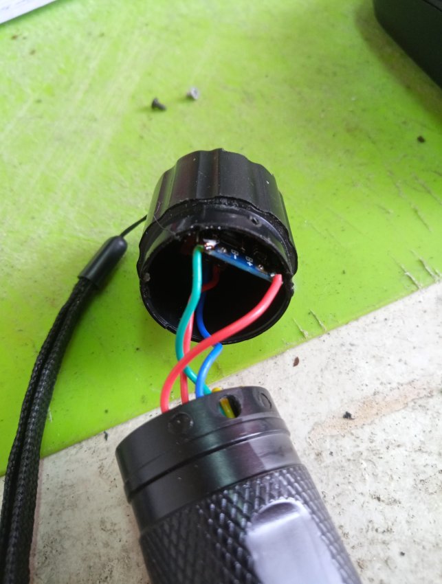Плата зарядки на место светодиода влезает в корпус. Красный провод это плюс, а зеленый минус аккумулятора.