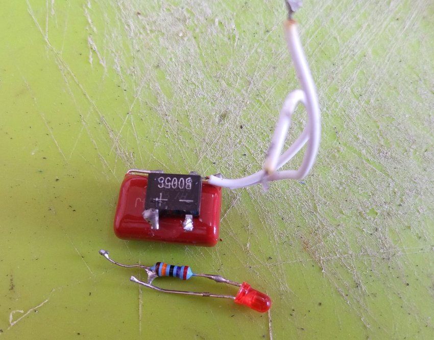 Зарядное устройство собрано на конденсаторе с диодным мостом, резистор и светодиод как индикатор питания из розетки. И это вся зарядка.