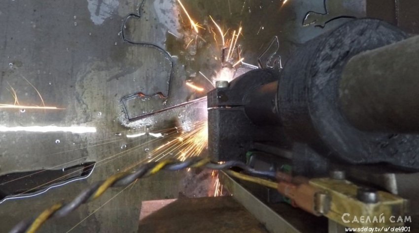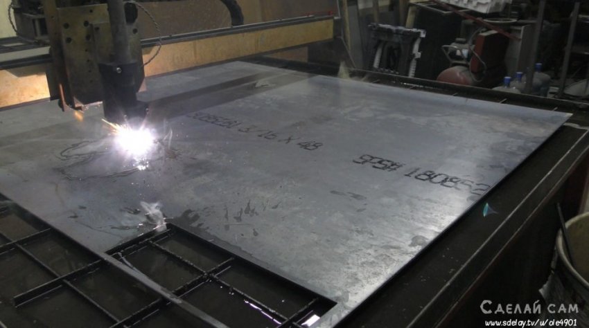 Вот как выглядит процесс работы. Лазер настолько мощный, что без проблем режет толстый лист стали.
